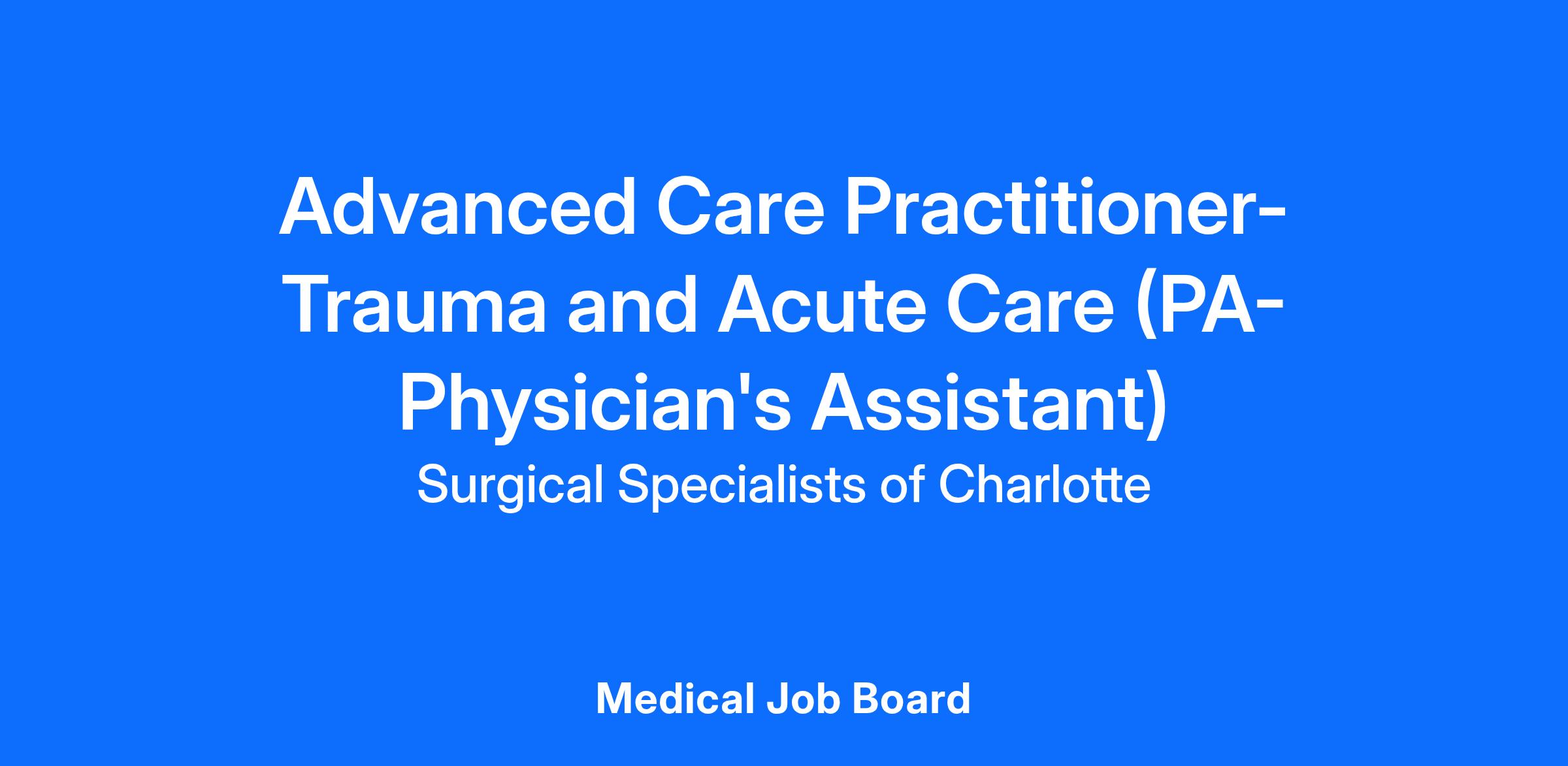 Surgical Specialists of Charlotte is seeking an Advanced Care Practitioner to join our program. The position is primarily based at Novant Health's Presbyterian Medical Center working with an existing care team of Physicians and ACPs.