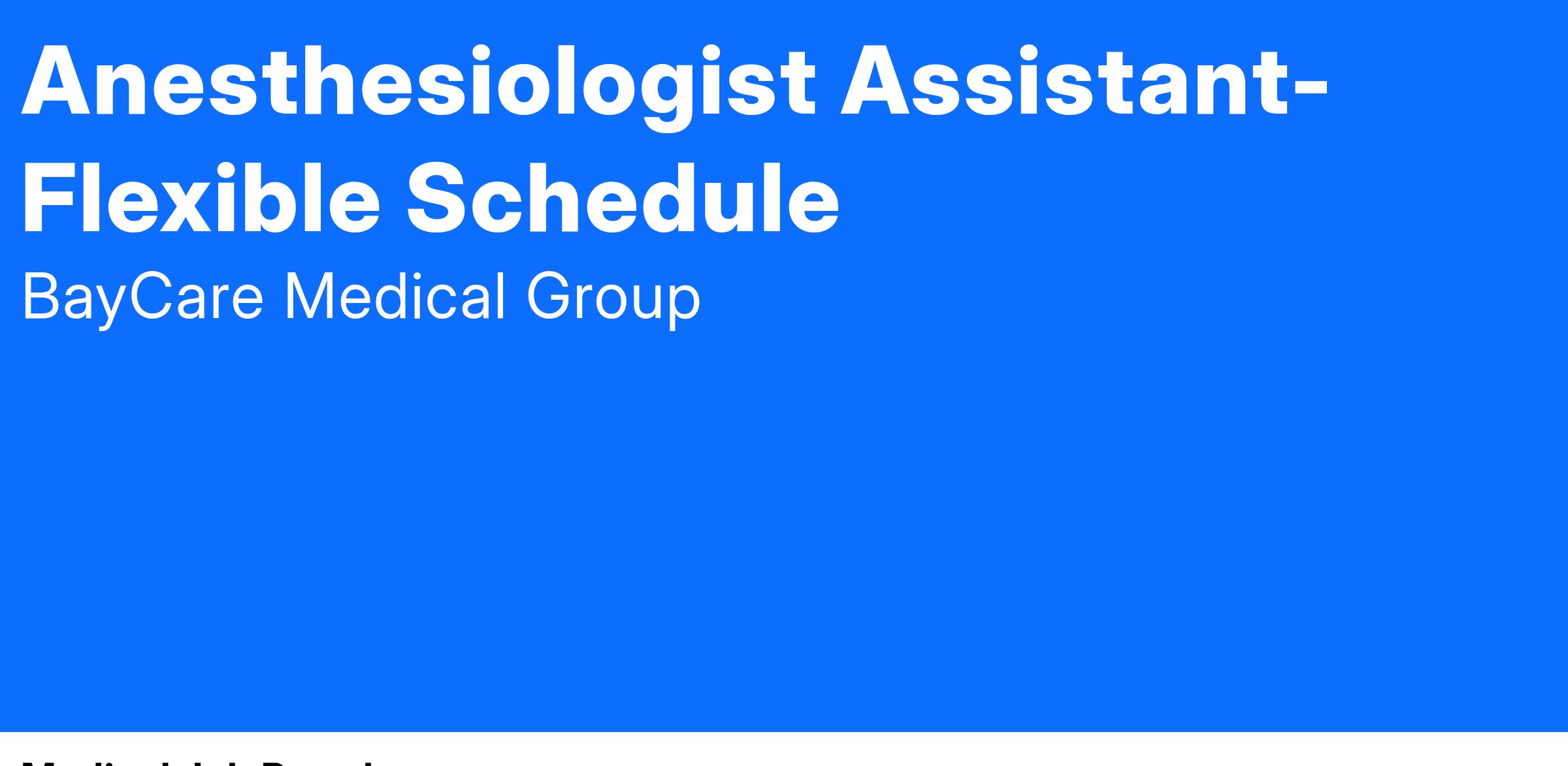 If you’re a qualified CAA looking for flexibility, collaboration, and a fulfilling role within a reputable healthcare system, apply today to join BayCare Medical Group. Enjoy the professional rewards and lifestyle benefits of serving in Tampa Bay area’s most trusted hospitals.