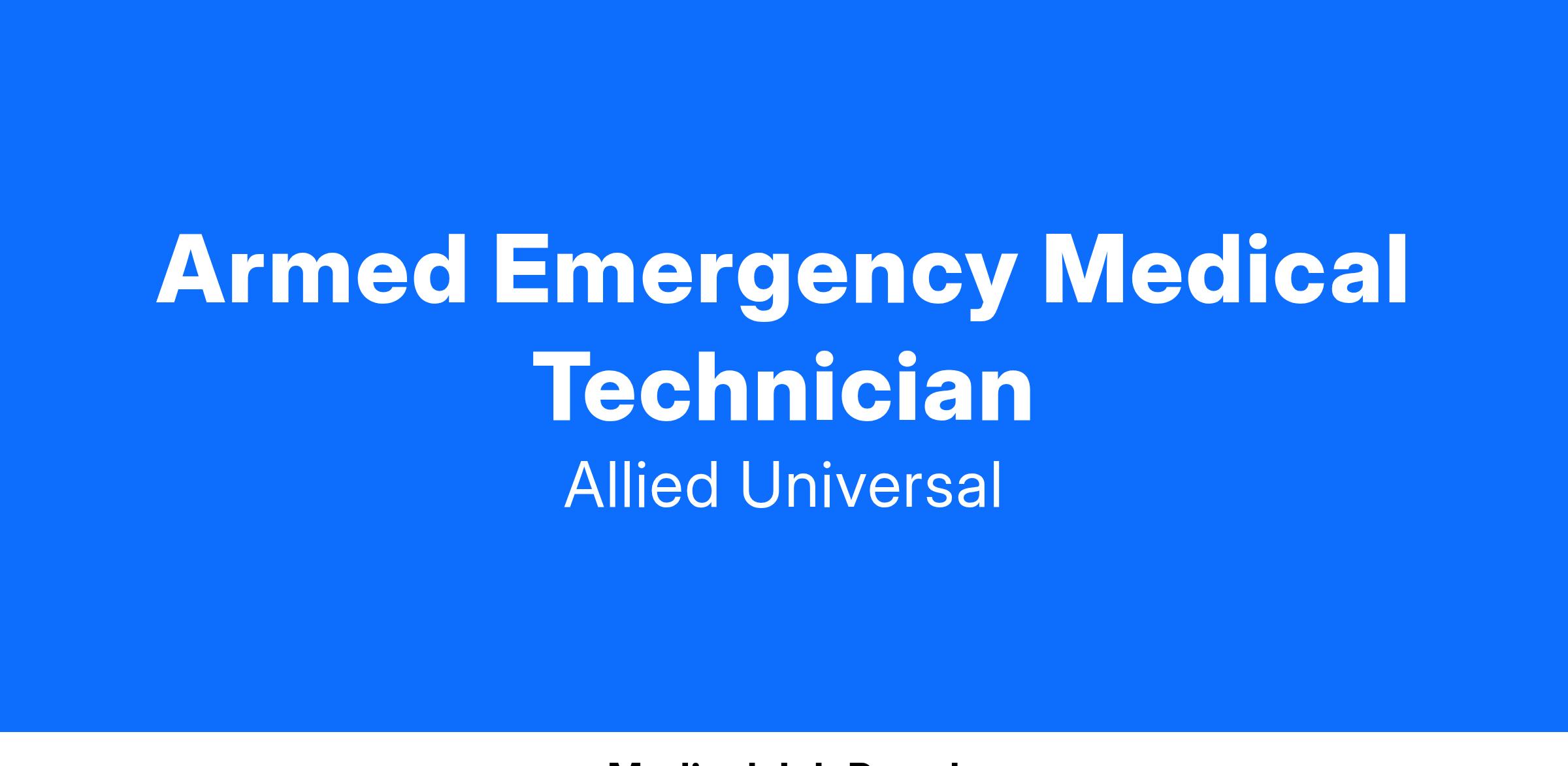 Allied Universal® is looking to hire an Armed Emergency Medical Technician (EMT). The Emergency Medical Technician (EMT) professionals will support coverage required by client procedure. The Emergency Medical Technician will respond to all medical emergencies, responding to the Protected Area (PA), Vital Area (VA), and Owner Controlled Area (OCA). This position will provide appropriate level of patient care to the extent of EMT Basic certification and client EMT protocols, assist Fire Brigade during fire drills and actual Fire Brigade response with an EMT on standby at the scene to provide immediate medical treatment, provide medical attention to contaminated patients during drills or actual emergencies, and assist in Security drills and in an actual security response.