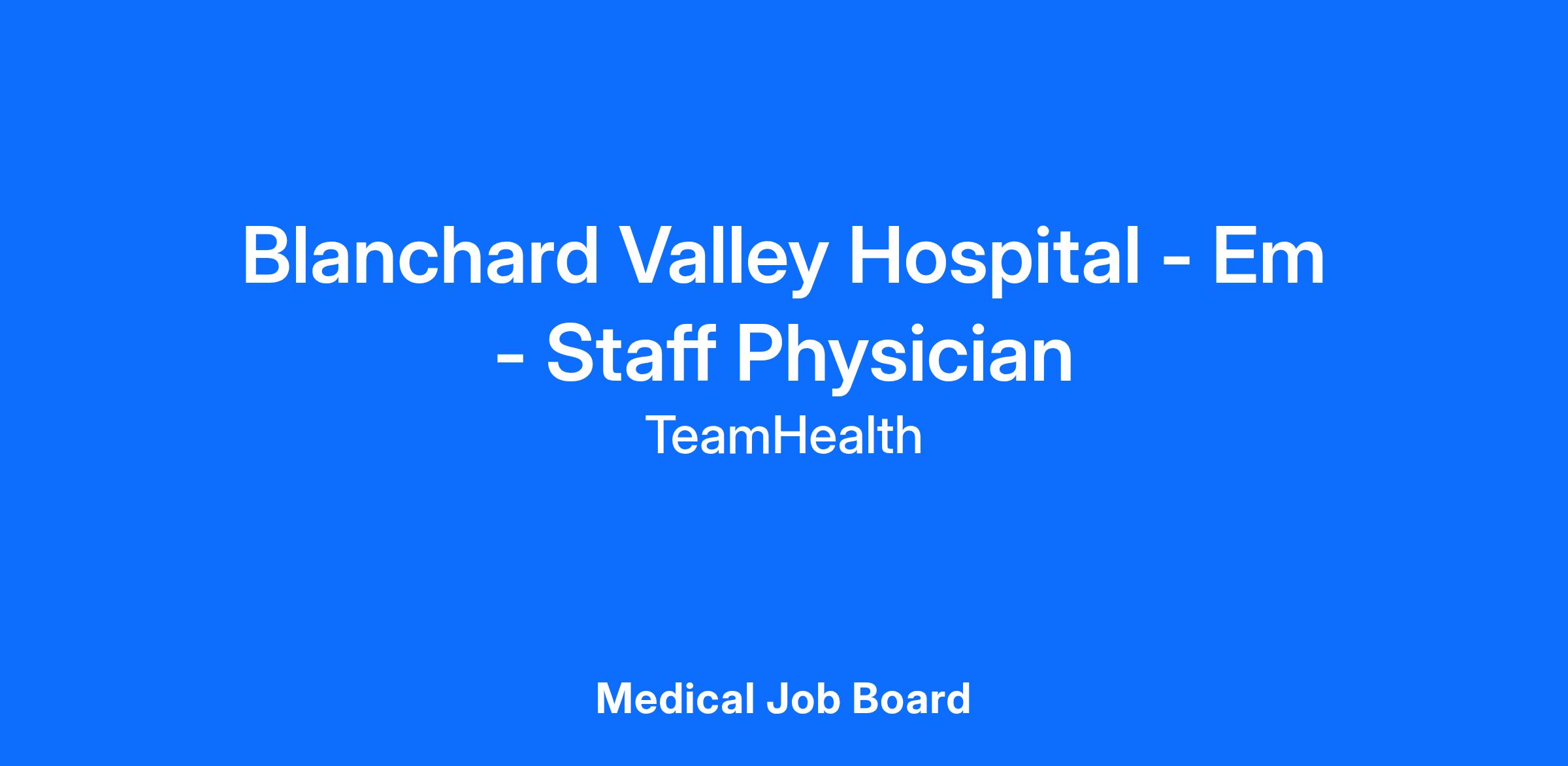 Job DescriptionFurther your career in emergency medicine with TeamHealth. Deliver safe, high-quality patient care as a physician in our emergency department (ED) team at Blanchard Valley Hospital in Findlay, Ohio. You'll be able to learn and grow alongside the best in emergency medicine (EM), with support from a dedicated medical director, mentors, education, and avenues for professional development that feed into your career path.