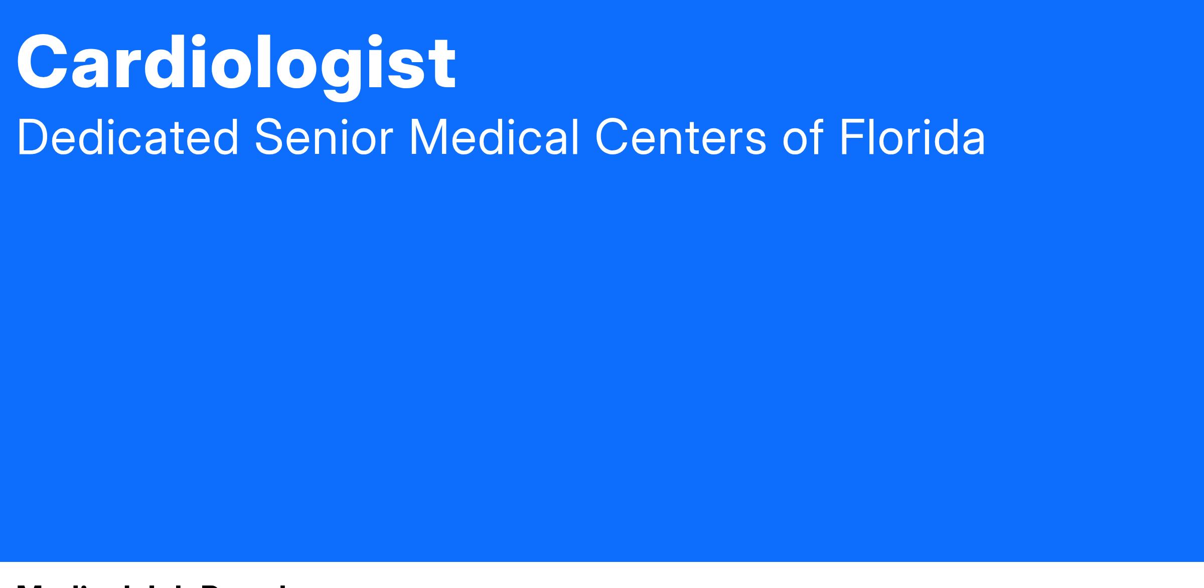 The Cardiologist is a Licensed/Board Certified professional who plays a key role as part of the clinical operations team, providing direct patient care and assessments, primarily in the ambulatory health care center setting. The responsibilities of the Cardiologist include but are not limited to: diagnosing and treating various cardiovascular ailments or diseases, such as heart attacks and coronary heart disease, taking medical history, conducting physical exams, developing a plan of care, providing health education, specialty referrals and case management referrals, providing follow-up care and applying clear, in-depth documentation through written progress notes and summaries according to ChenMed standards for quality, service, productivity and teamwork. He/She also participates in clinical rounds and conferences.