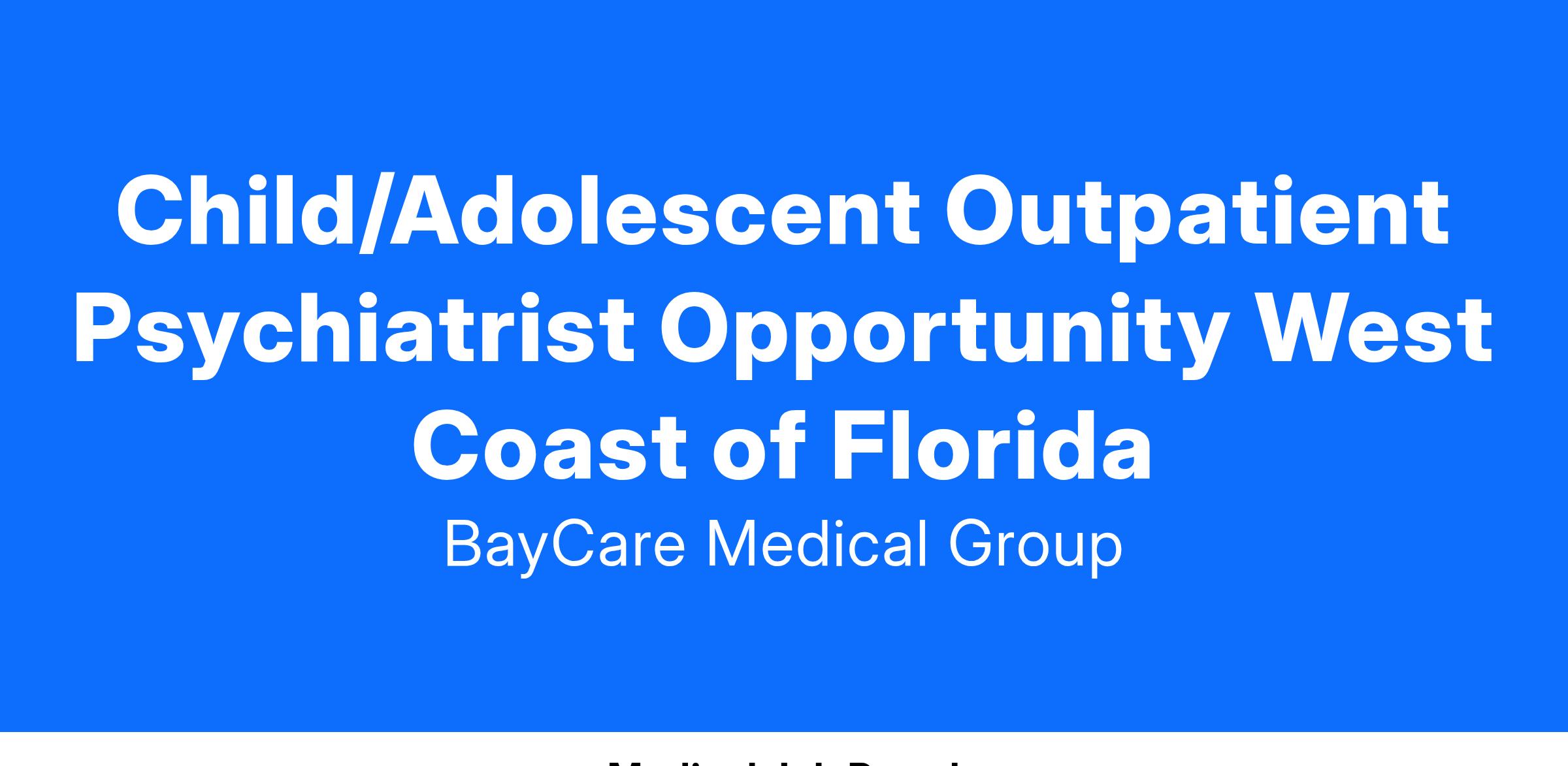 The Child/Adolescent Outpatient Psychiatrist will play a crucial role in our expanding BayCare Behavioral Health team. The ideal candidate should be Board Certified or Board Eligible in Child/Adolescent Psychiatry, with preference given to those with prior experience. This position offers a dynamic work environment, where you'll contribute to the growth of our psychiatry program and actively participate in our aggressive expansion plan to better serve the needs of our local communities.