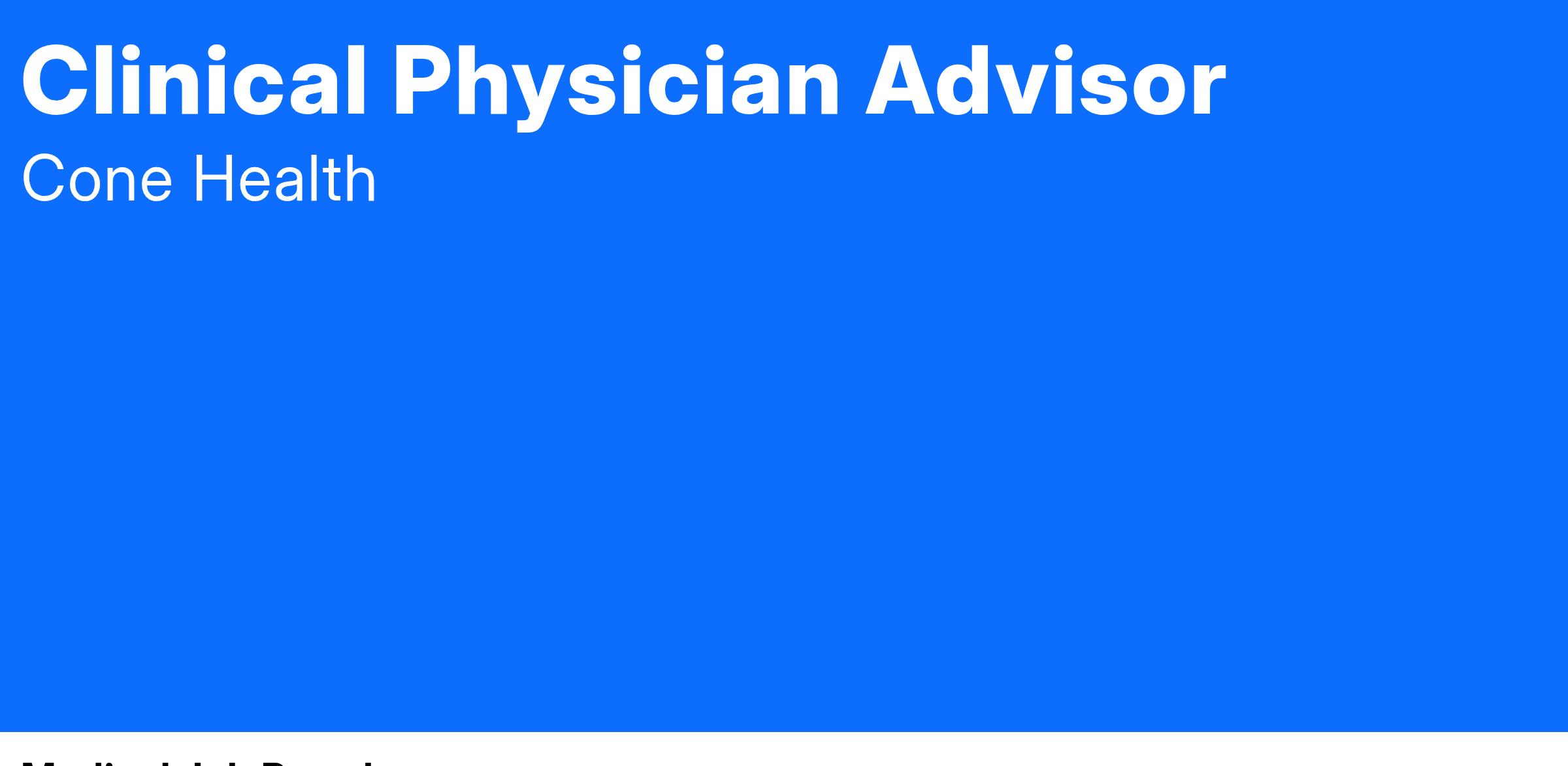 Educational/Licensure Requirements: Doctor of Medicine (MD), Doctor of Osteopathy (DO) or equivalent degree and board certified in area(s) of specialty, NC medical license, full unrestricted DEA, Cone Health medical staff membership, and other employment requirements. Required: Physician Advisor Certification, Graduate of Physician Leadership Academy (Cone Health) or equivalent degree with education/preparation in healthcare administration and/or leadership development.