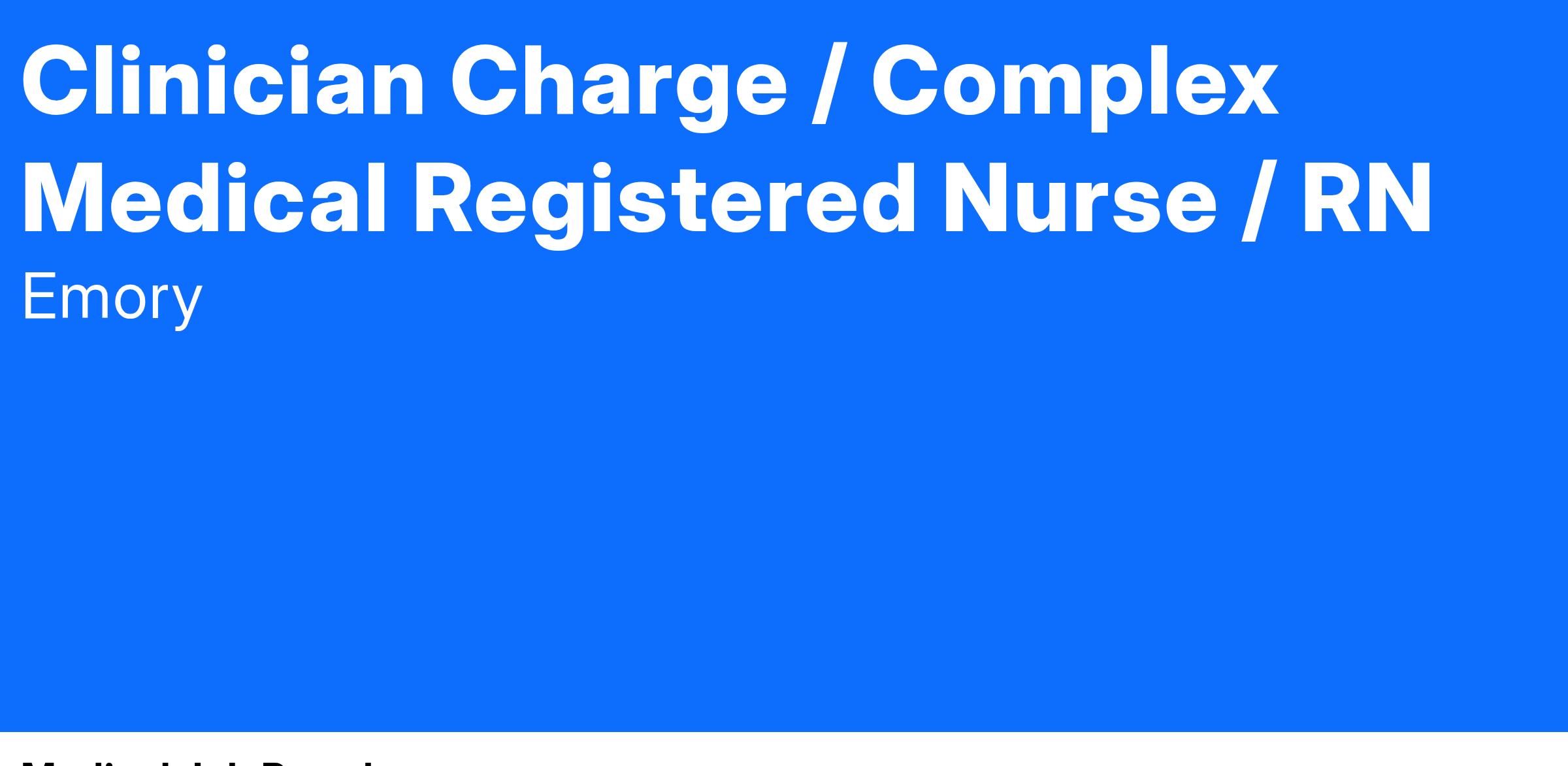 We're seeking a Clinician Charge, Complex Medical Department responsible for being a capable clinician who has acquired broad experience in caring for patients and has developed a sound understanding about the care of a particular patient population and routinely uses acquired knowledge, theory, research and experience to respond to changes in clinical situations. This RN professional can apply the Synergy Model for Care in practice and use this knowledge to personalize care for each patient/family while serving as a resource to colleagues and strong advocate for them.