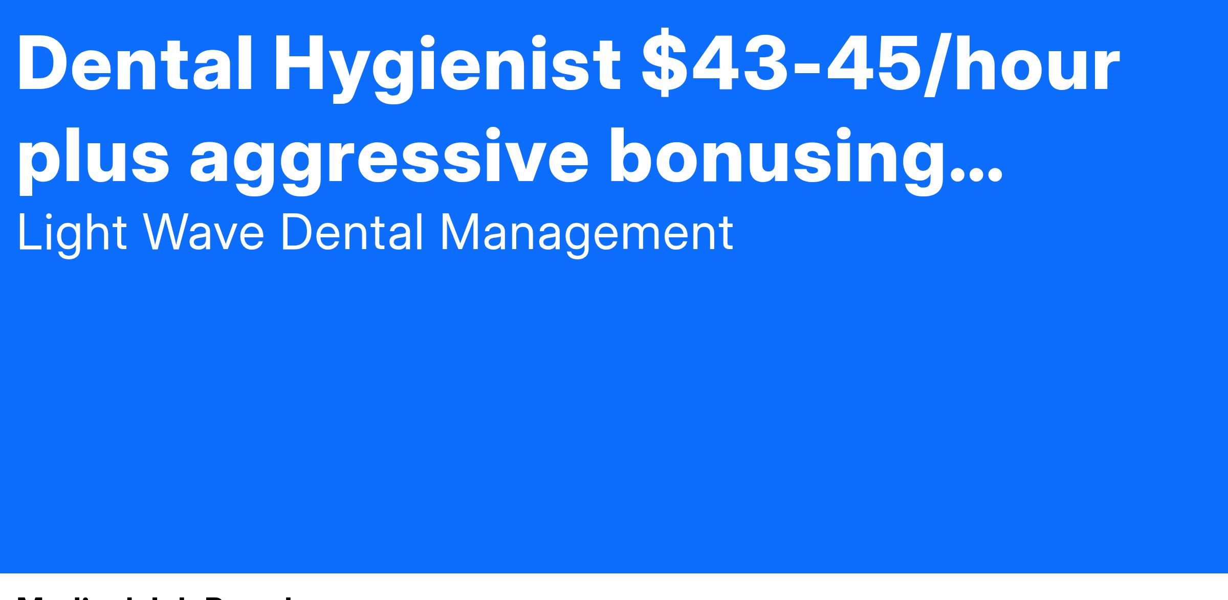 As a key part of our patient care team, our dental hygienists are offered a substantial benefits package that includes health and dental benefits, long- and short-term disability, life insurance, 401(k) with 4% matching, holiday pay and paid time off, CEs offered at no charge, positive work environment, and hygiene culture coaching.