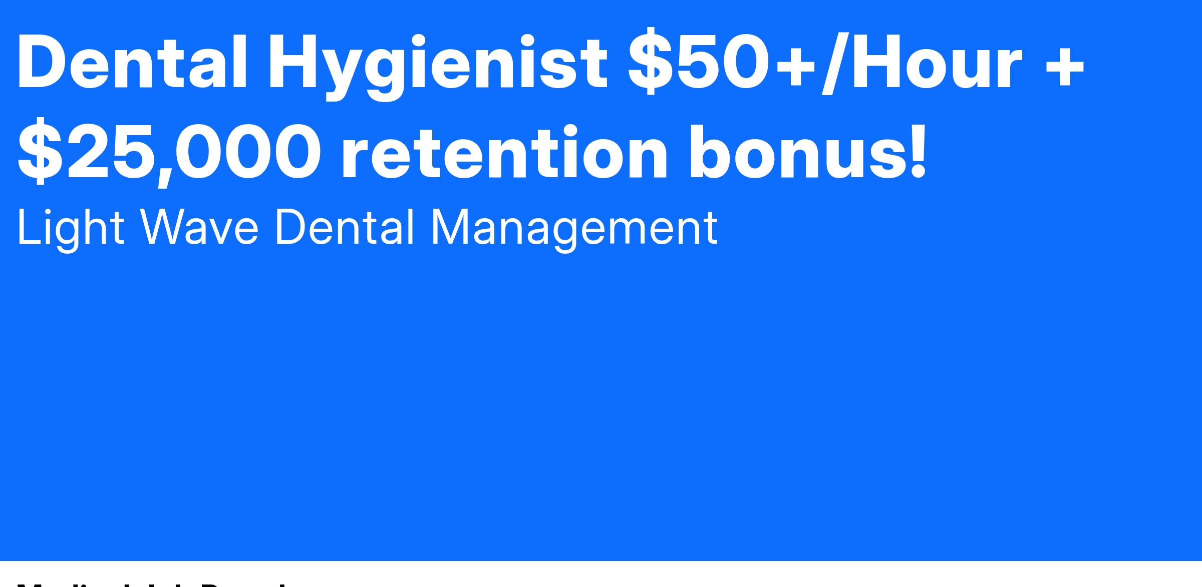 As a key part of our patient care team, our dental hygienists are offered a substantial benefits package that includes health and dental benefits, long- and short-term disability, life insurance, 401(k) with 4% matching, holiday pay and paid time off, CEs offered at no charge, positive work environment, and hygiene culture coaching.