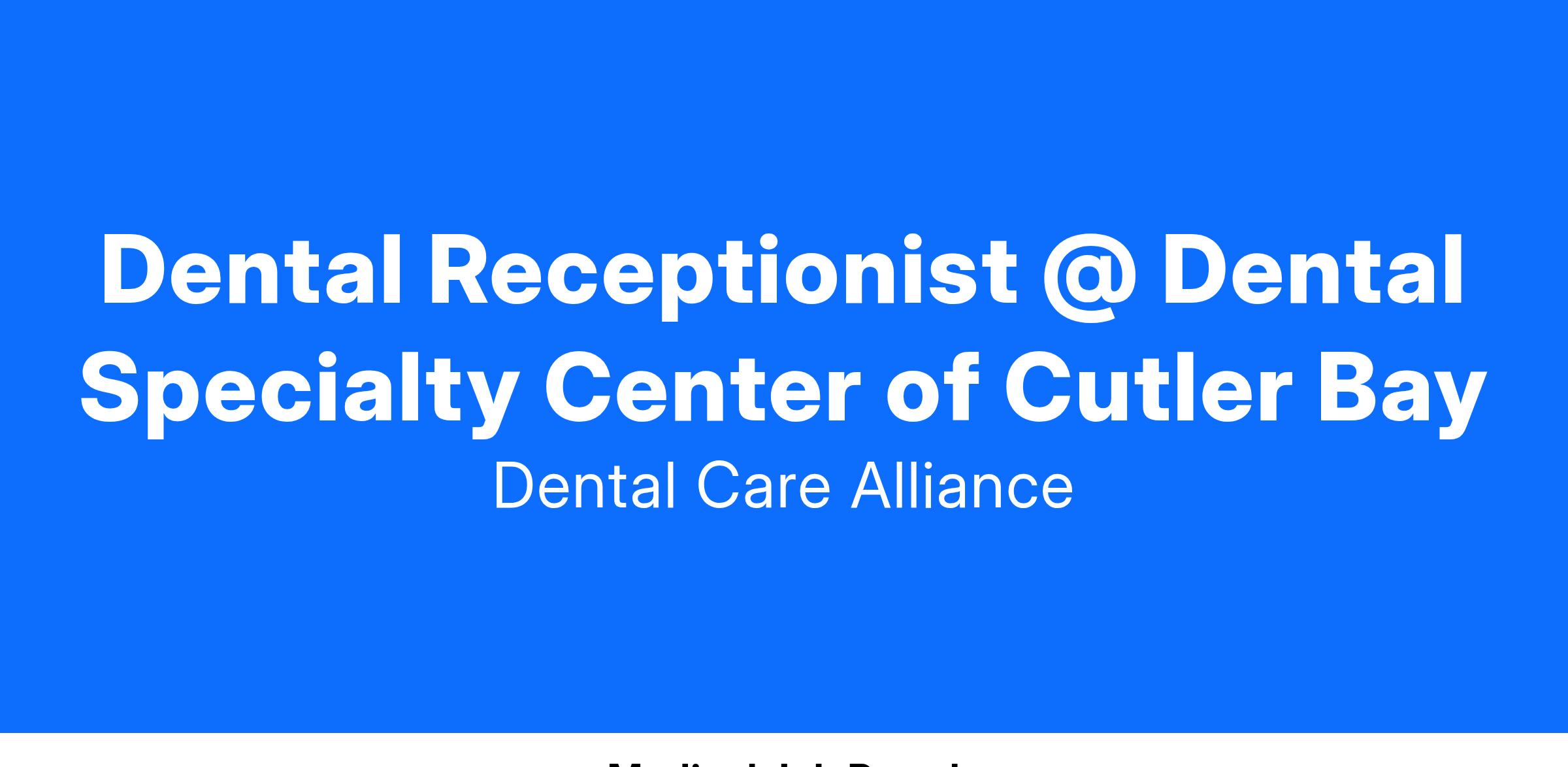 We are seeking a skilled and organized Dental Receptionist to join our team at our dental practice located in Cutler Bay, FL. As a Dental Receptionist, you will be responsible for providing exceptional customer service and administrative support to ensure the smooth operation of our dental office. If you have experience in dental administrative support, excellent communication skills, and a passion for delivering top-notch patient care, we encourage you to apply.