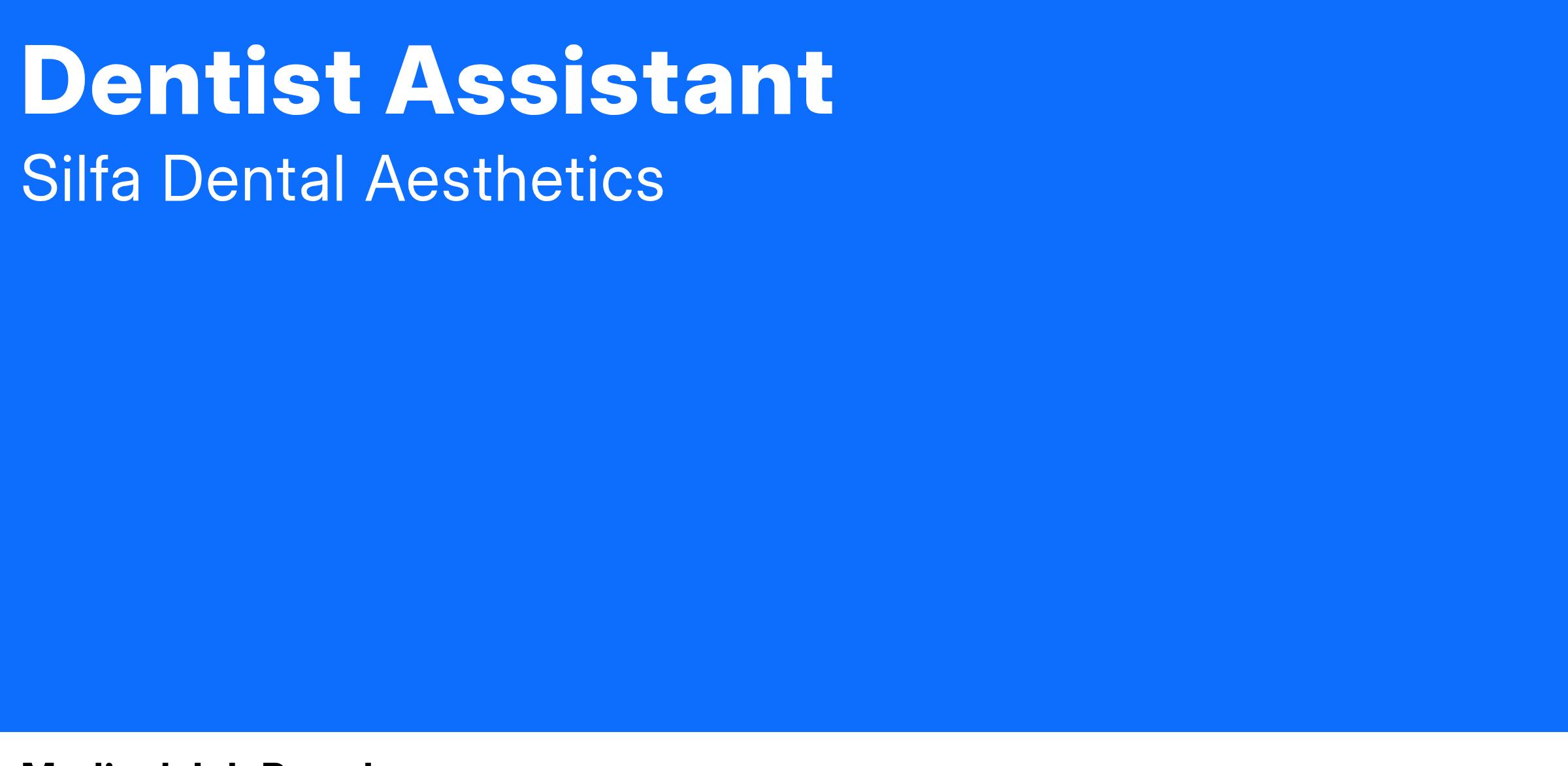 If you're passionate about helping people smile brighter and love working in a dynamic, team-oriented environment, Silfa Dental Aesthetics in Commack, NY, has the perfect opportunity for you! Join us as a full- or part-time Dentist Assistant and enjoy competitive pay and great benefits while building a career you can be proud of. No matter your experience-whether it's dental or hospitality-this is your chance to shine.