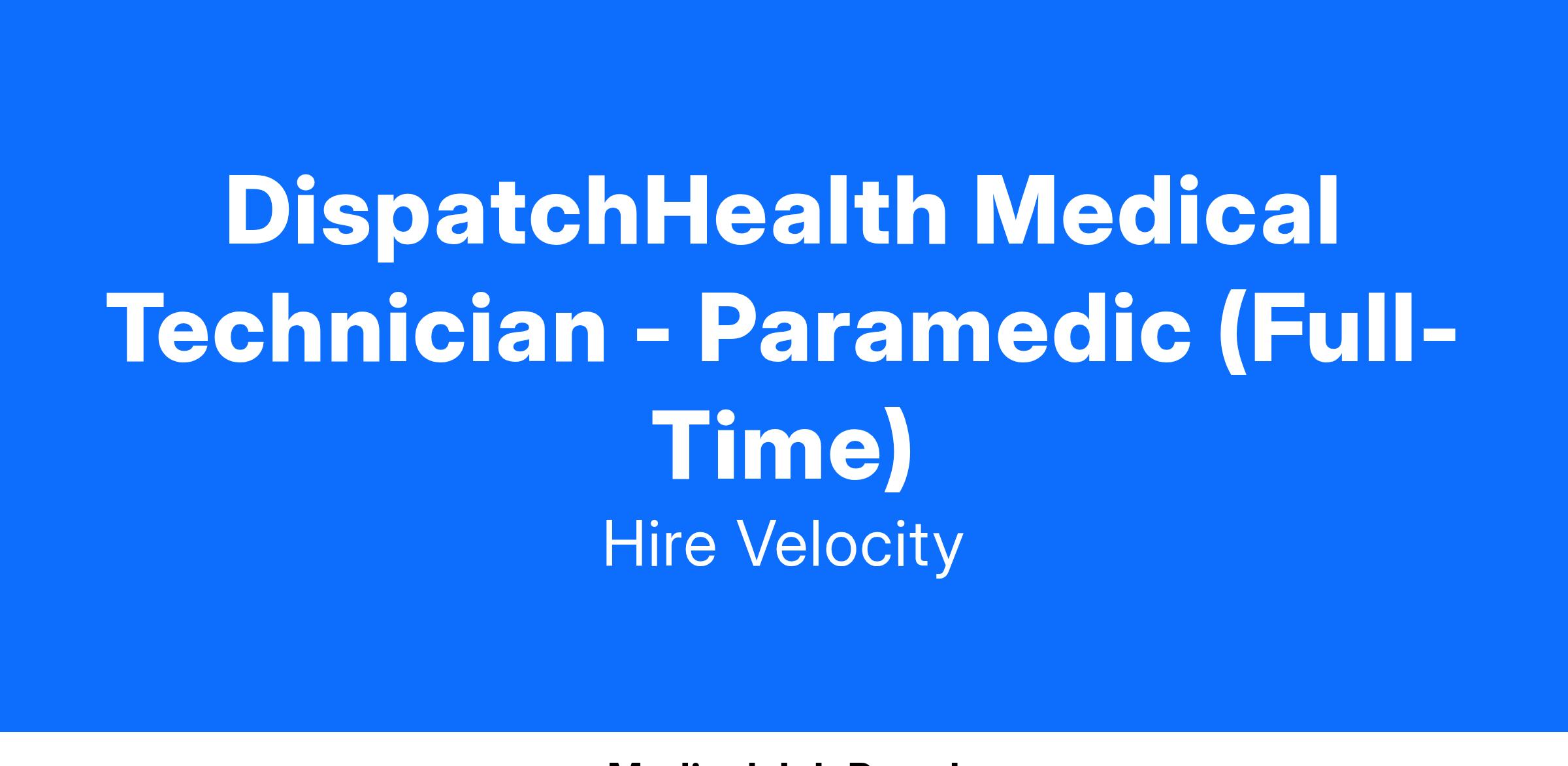 The DispatchHealth Medical Technician - Paramedic supports patient care by assisting with physical exam, point of care testing, treatments and data gathering. The DHMT works at the direction of a virtual DispatchHealth Advanced Practice Provider (Nurse Practitioner or Physician Assistant) while being present with patients in their homes. Strong organizational and customer service skills are keys to success as the DHMT. Extensive on-the-job training will be provided for this exciting opportunity to assist in the delivery of hospital-level healthcare in the comfort of a patient’s home.