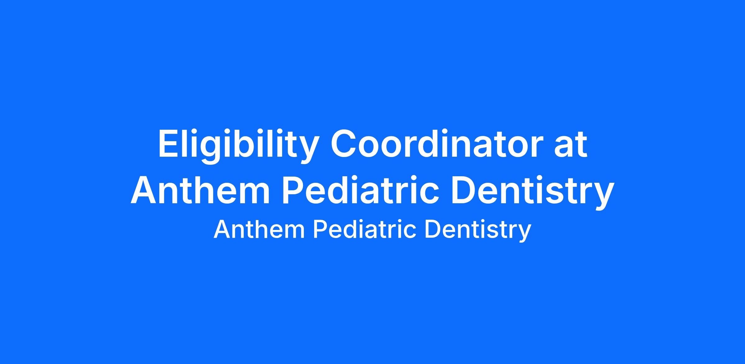 Anthem Pediatric Dentistry is looking for a dedicated and skilled Eligibility Coordinator to join our dynamic team. Known for our commitment to outstanding patient care and innovative treatments, we offer an environment where you can grow professionally while making a meaningful impact on the community. The ideal candidate is motivated, compassionate, and eager to provide exceptional care.