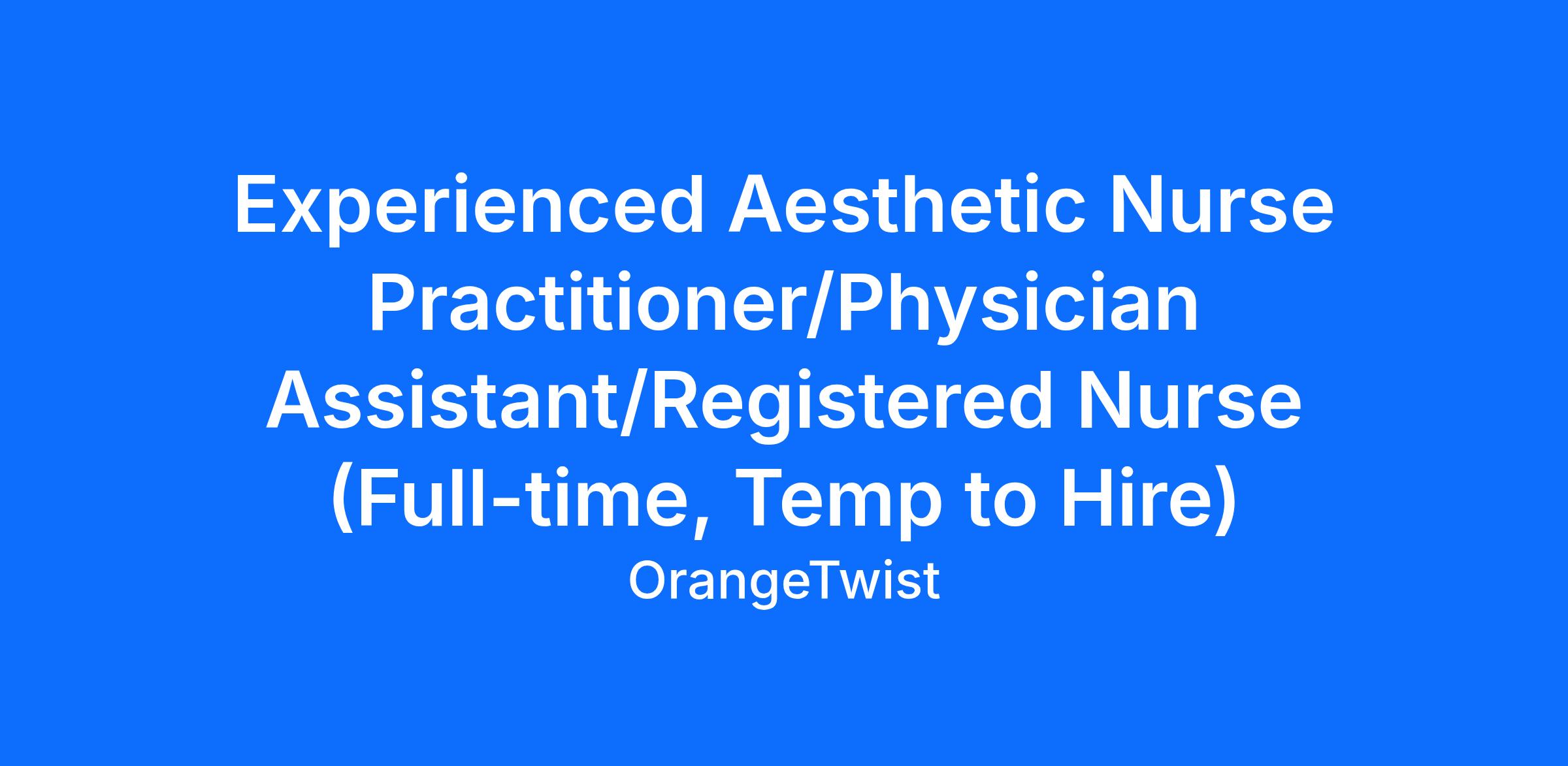 We are seeking an Aesthetic Nurse Practitioner/Physician Assistant/Registered Nurse to join our OrangeTwist Team. The Aesthetic Nurse Practitioner/Physician Assistant/Registered Nurse will provide high-quality aesthetic treatments and services to OrangeTwist clients. They will collaborate closely with the team to ensure the delivery of exceptional client care and promote a positive client experience.