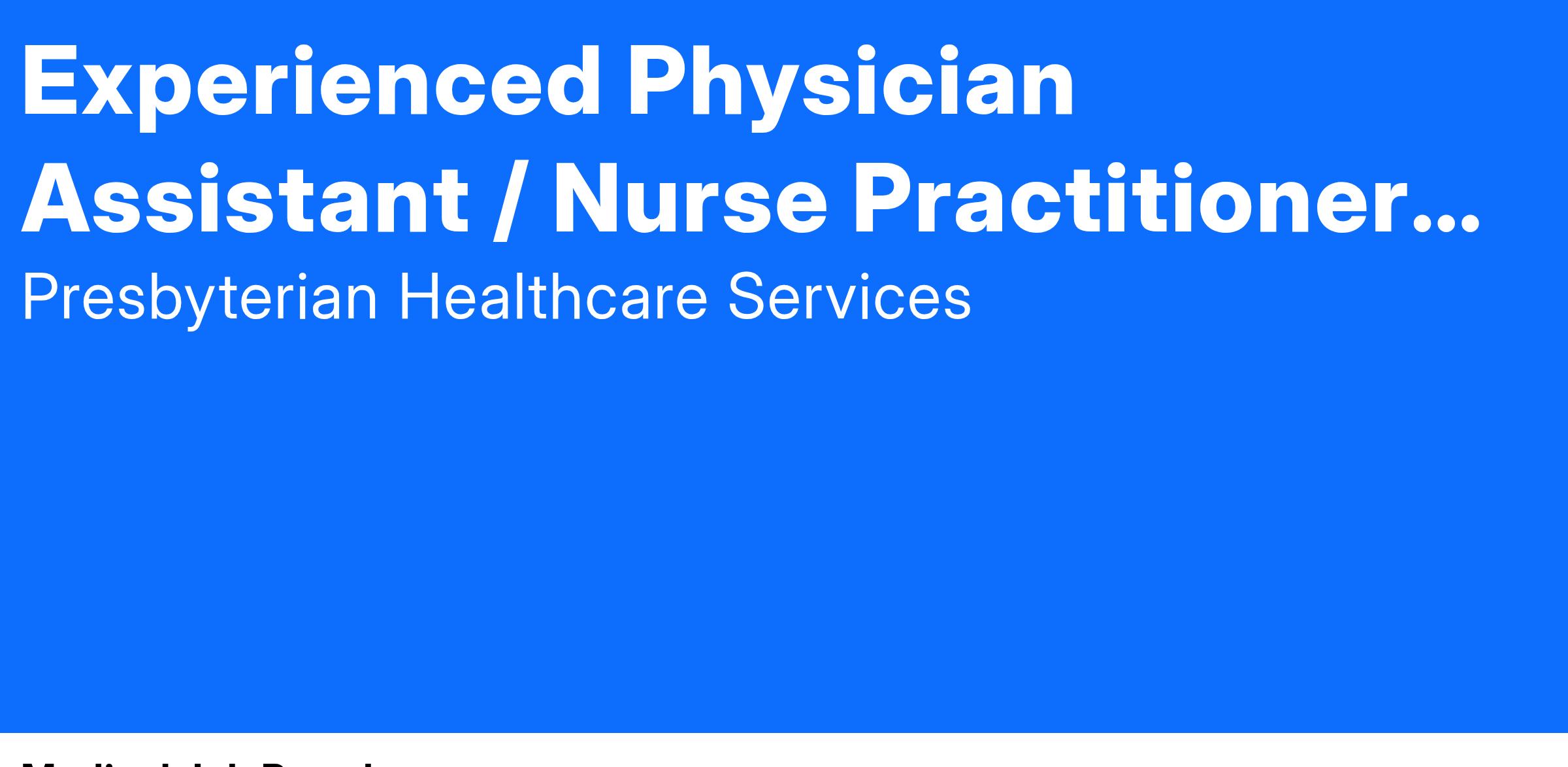 Presbyterian Medical Group seeks a Board Eligible / Board Certified Physician Assistant or Nurse Practitioner to join our established practice in Socorro, New Mexico. We're all about well-being, starting with yours. We offer a nationally competitive salary with relocation allowance available, CME allowance and fully paid malpractice insurance.