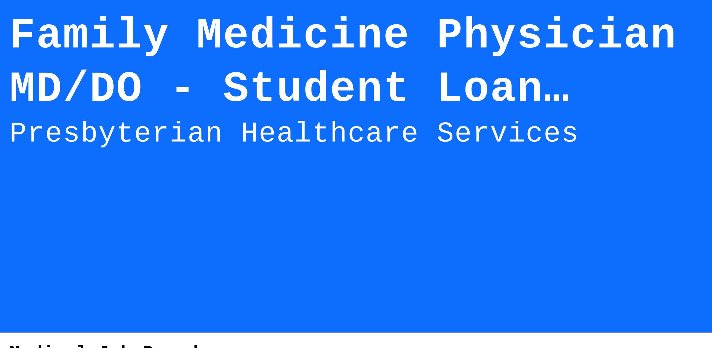 Presbyterian Medical Group seeks a Board Eligible / Board Certified Family Medicine Physician to join our established practice in Espanola, New Mexico located near Santa Fe, NM. We're all about well-being, starting with yours. We offer a nationally competitive salary with relocation allowance available, CME allowance and fully paid malpractice insurance.