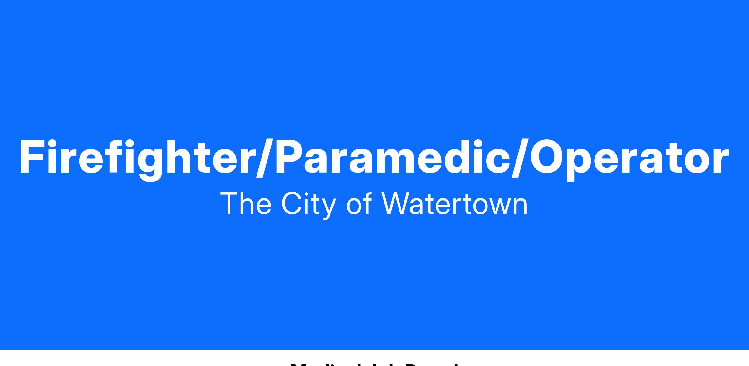 The Watertown Fire Department is currently accepting applications for the position of full-time Firefighter/Paramedic/Operator with the City of Watertown. We are looking for energetic personnel that are dedicated to providing public service in areas of fire protection, emergency medical services, fire prevention, and public education.