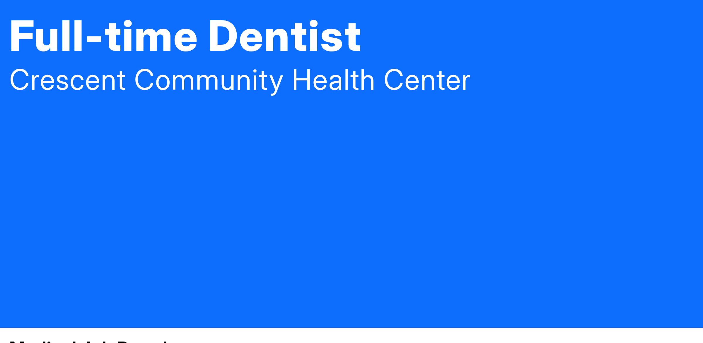 Crescent Community Health Center is seeking a full-time Dentist, as we expand our dentistry services through an expanded dental clinic.