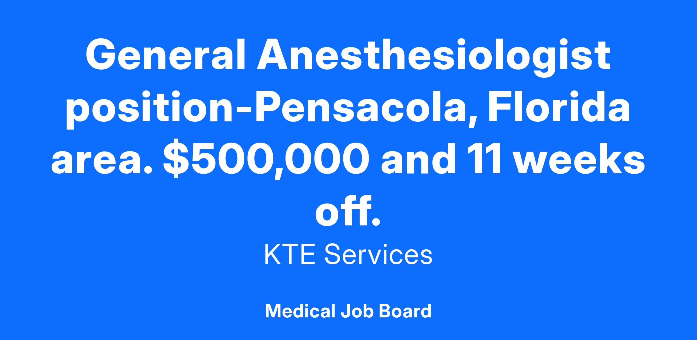 General Anesthesiologist position-Pensacola, Florida area. $500,000 and 11 weeks off.