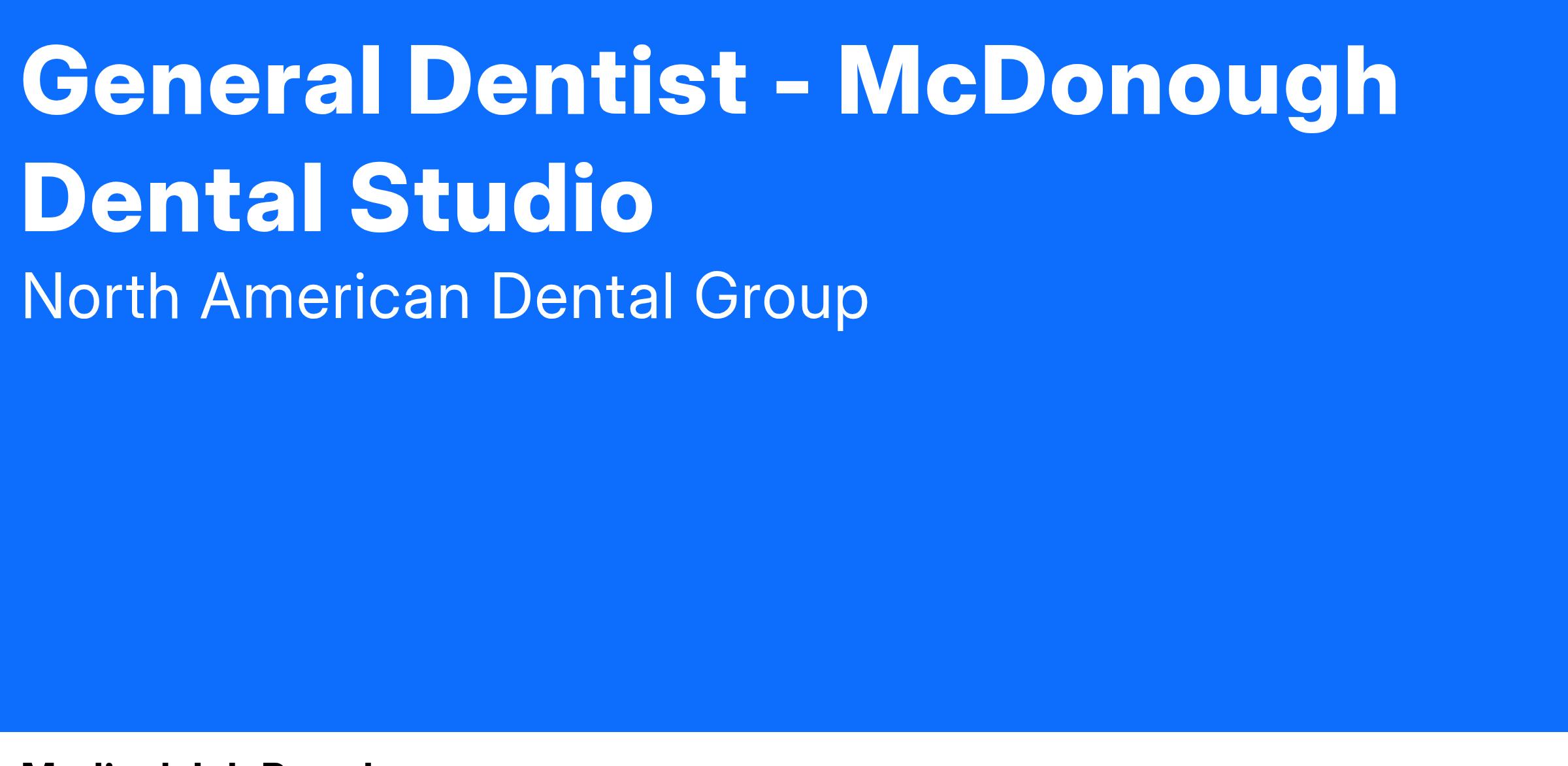 McDonough Dental Studio is seeking a full-time General Dentist to join our established, high-performing team. We are a dentist-owned group practice focused on patient-centered care, clinical excellence, and long-term growth. This is a great opportunity for a motivated provider who thrives in a collaborative, well-supported environment.