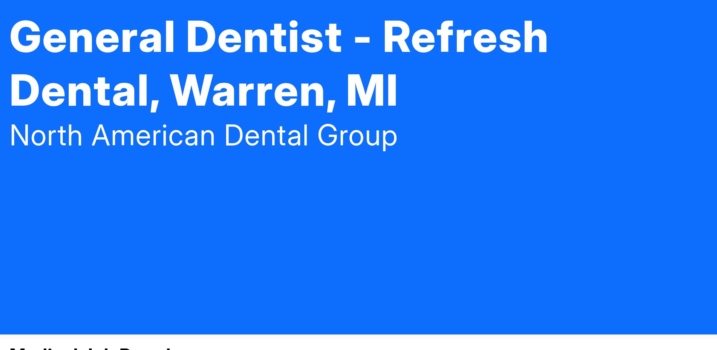Refresh Dental has a full-time opportunity for a General Dentist in our dentist-owned, patient-focused, community-based group practice in Warren, MI
