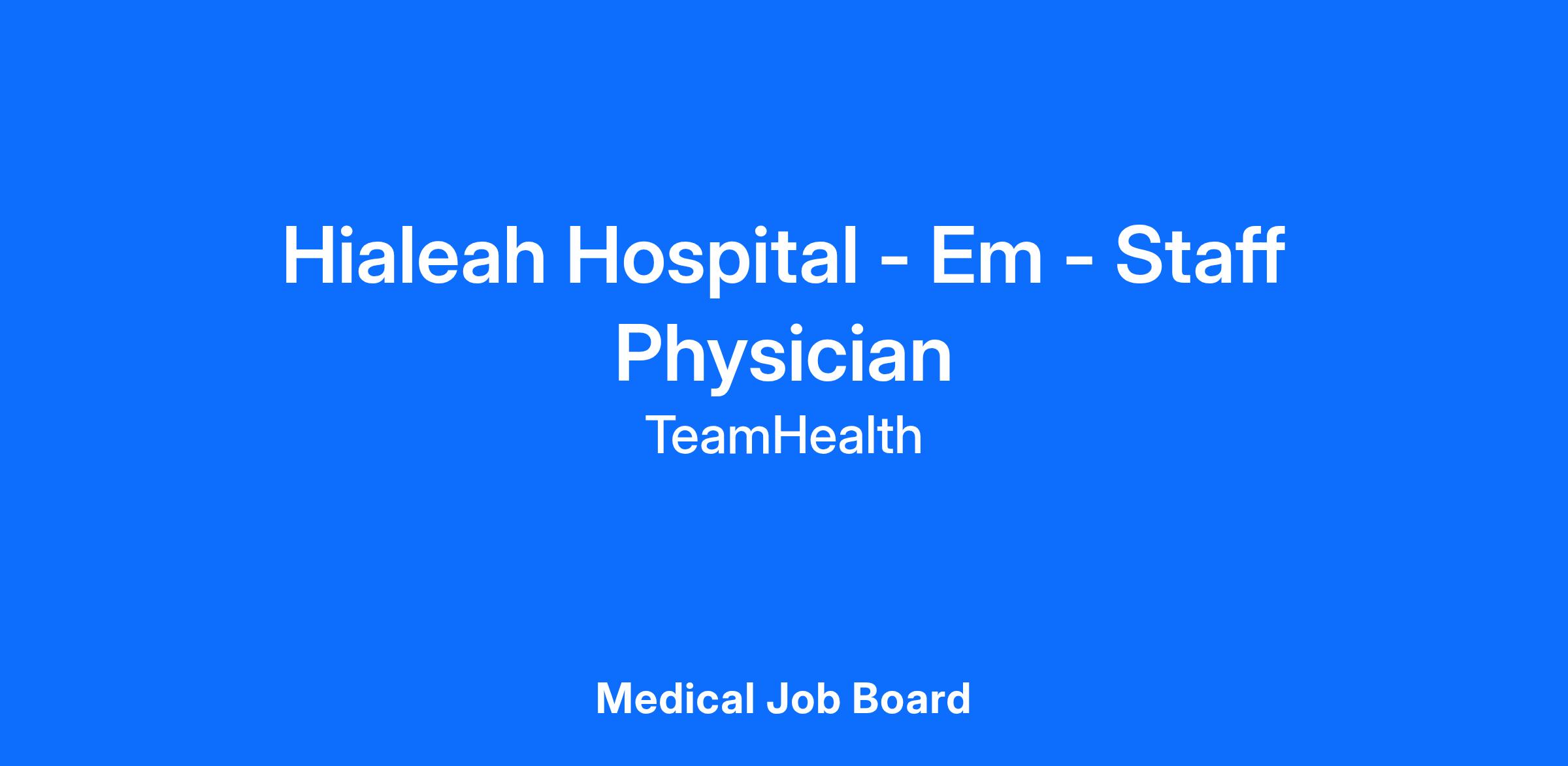 Job DescriptionAre you seeking a long-term career in emergency medicine (EM) and opportunity for advancement? TeamHealth has what you're looking for! This is a full-time, bilingual role in a very busy community hospital! Candidates must be board prepared or certified in EM. Hialeah Hospital is located in Miami - a great place to live, centrally located in Miami-Dade County. It is just minutes from Miami International Airport, and close to both the beach and the exciting sporting events and night life of South Beach and Downtown Miami/Brickell. At TeamHealth, our purpose is to perfect our physicians' ability to practice medicine, every day, in everything we do. Our philosophy is as simple as our goal is singular: we believe better experiences for physicians lead to better outcomes for patients, partners, and physicians alike.