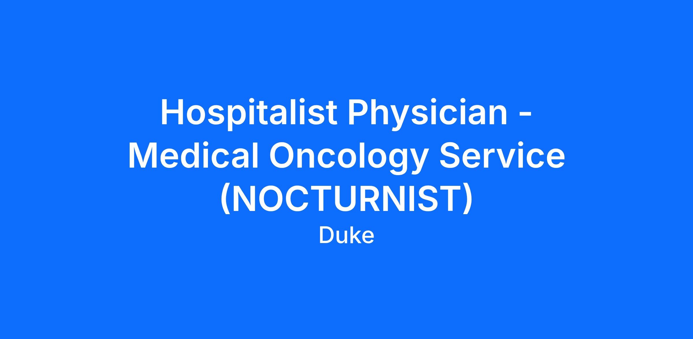 Duke’s Division of Medical Oncology and the Duke Cancer Institute are actively recruiting for a Nocturnist Hospitalist Physician to integrate into our Medical Oncology / Solid Tumor Service. Nocturnist Hospitalist Physicians in Oncology are clinicians and/or clinician educators who provide clinical care for adult oncology patients admitted at Duke University Hospital during the overnight shift of 7pm – 7am.