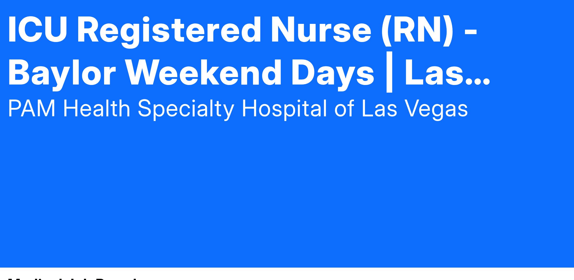 PAM Health Specialty Hospital of Las Vegas is a 70 bed Critical Care Hospital providing acute care services to patients recovering from serious illnesses or injuries. Often our patients require additional critical care services for medically complex conditions such as trauma, infectious diseases, wound healing, cardiovascular disease, stroke, amputation and ventilator weaning. We offer an opportunity to work in a fast-paced and friendly work environment where you really get to know your patients and their families.