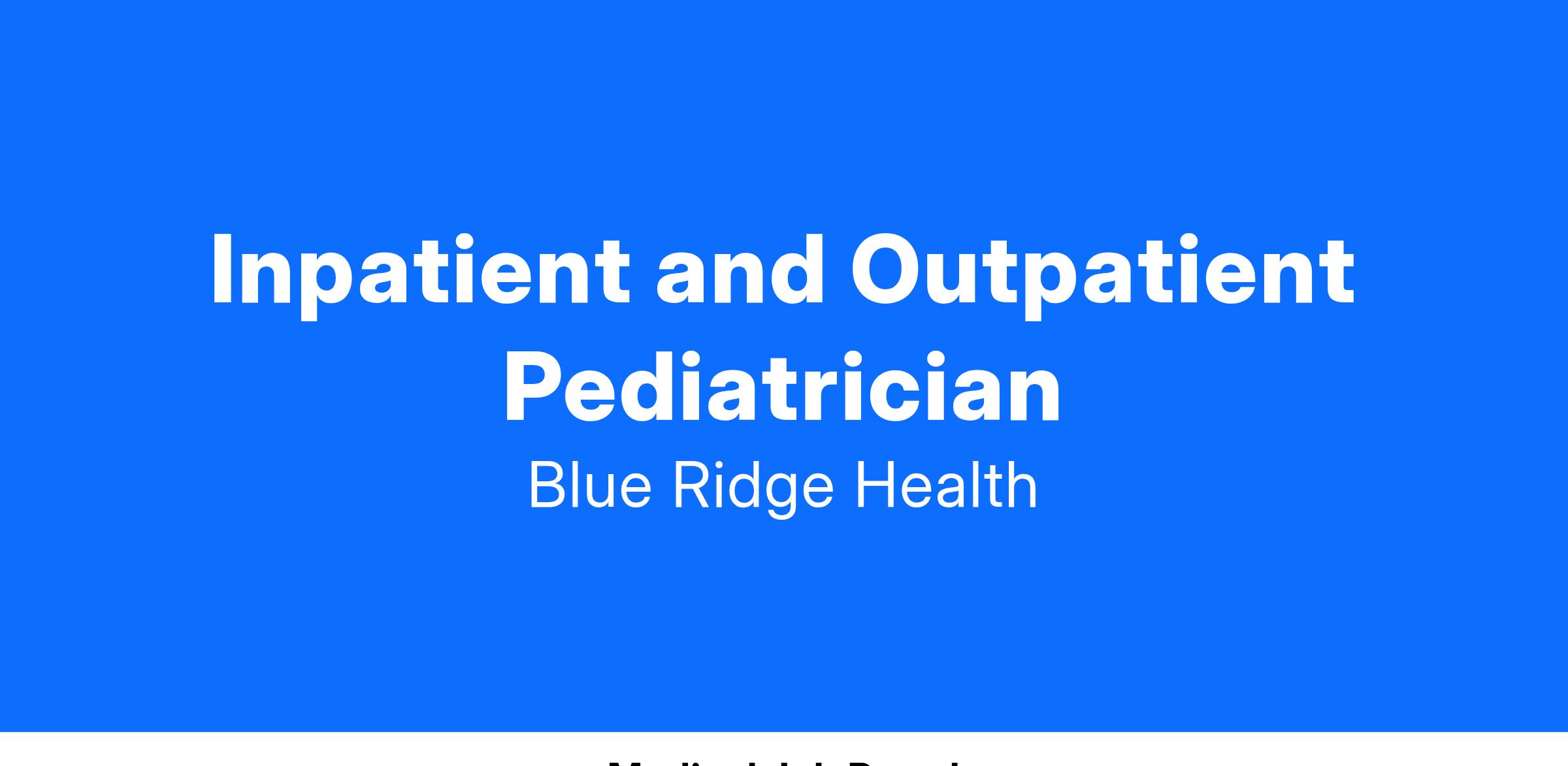 Blue Ridge Health (BRH) is recruiting for a community-minded Inpatient and Outpatient Pediatrician to join our team. BRH is a Federally Qualified Health Center serving communities across the mountains of western North Carolina.