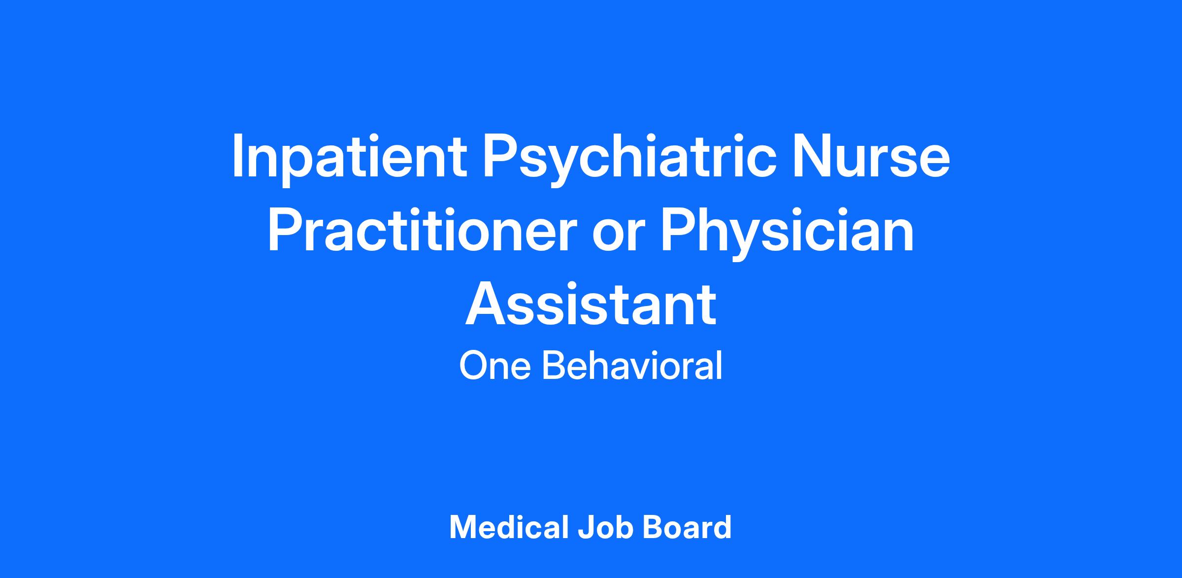 One Behavioral is on a continued path for growth. We are looking to add full-time Psychiatric Mental Health Nurse Practitioners (PMHNP) or Physician Assistants (PA) specializing in Behavioral Health to our team. This position includes 2 weekend calls per month. We hope that our providers will contribute to our mission and embody our values. In addition to patient care, employee satisfaction is our top priority.