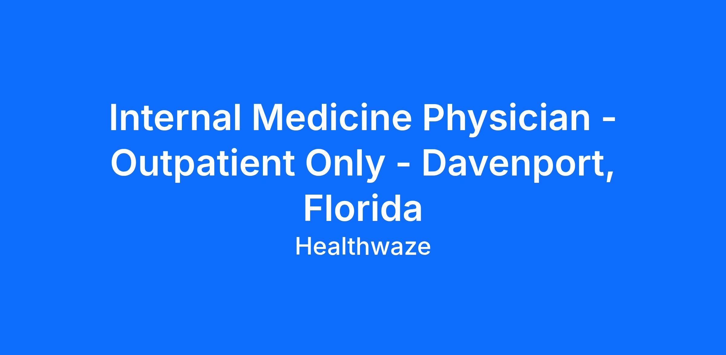 <\/html>"}}],"isMobile":false,"iframe":"true","jobType":"Full time","applyName":"Apply Now","zsoid":"681892850","FontFamily":"PuviRegular","jobOtherDetails":[{"fieldLabel":"Job Specialty","uitype":100,"value":"Internal Medicine"},{"fieldLabel":"Industry","uitype":2,"value":"Medical"},{"fieldLabel":"Work Experience","uitype":2,"value":"1\-3 years"},{"fieldLabel":"Salary","uitype":1,"value":"250000"},{"fieldLabel":"City","uitype":1,"value":"Davenport"},{"fieldLabel":"State\/Province","uitype":1,"value":"Florida"},{"fieldLabel":"Zip\/Postal Code","uitype":1,"value":"33837"}],"headerName":"Internal Medicine Physician \- Outpatient Only \- Davenport, Florida","widgetId":"510822000000072311","isJobBoard":"false","userId":"510822000000235003","attachArr":[],"customTemplate":"3","isCandidateLoginEnabled":true,"jobId":"510822000012749155","FontSize":"15","googleIndexUrl":"https:\/\/healthwaze.zohorecruit.com\/recruit\/ViewJob.na?digest=R7OE9kcl7@SEvw8byZXTq0bPUgF7vSqaWlDdzfDfOrc\-&embedsource=Google","location":"Davenport","embedsource":"CareerSite","indeedCallBackUrl":"https:\/\/recruit.zoho.com\/recruit\/JBApplyAuth.do","logoId":"egevpa7c0a961d0cb45208ac9d3f986287815"}