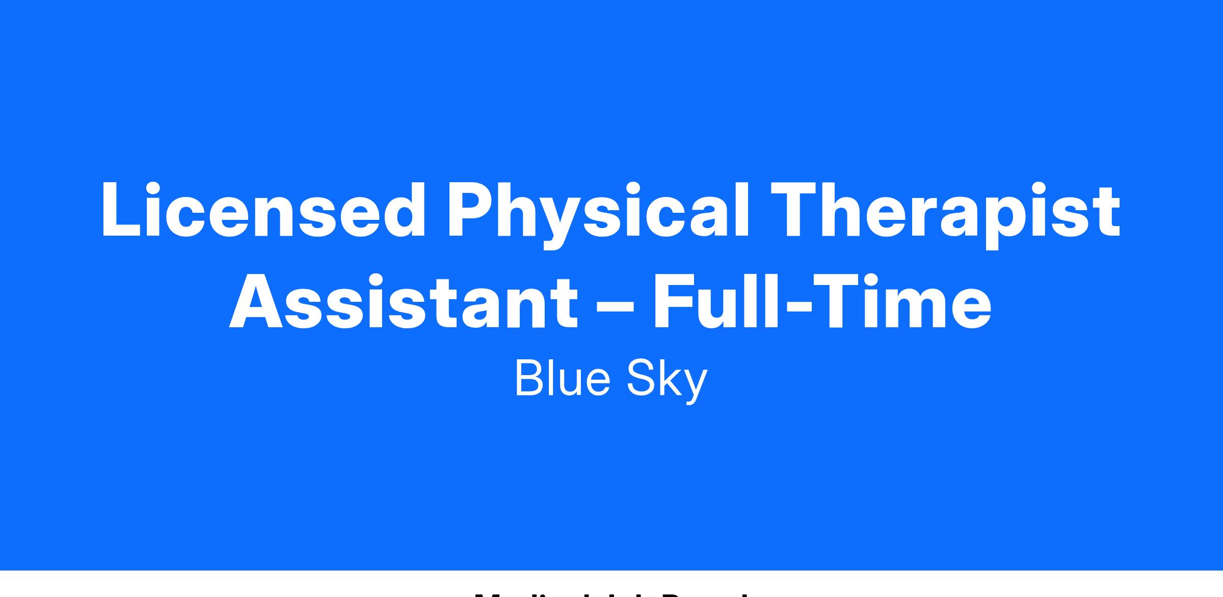 Blue Sky Therapy is hiring! We are looking for a passionate full-time Physical Therapist Assistant to join our growing team. In the same way that you are committed to quality work, we are equally dedicated to helping you grow and succeed with us.