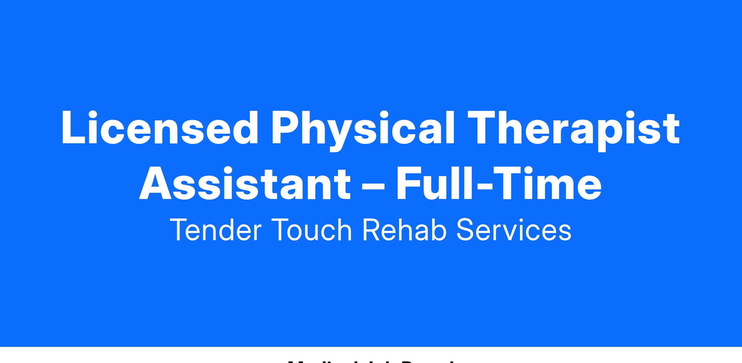 Tender Touch Rehab is hiring! We are looking for a passionate full-time Physical Therapist Assistant to join our growing team. In the same way that you are committed to quality work, we are equally dedicated to helping you grow and succeed with us.