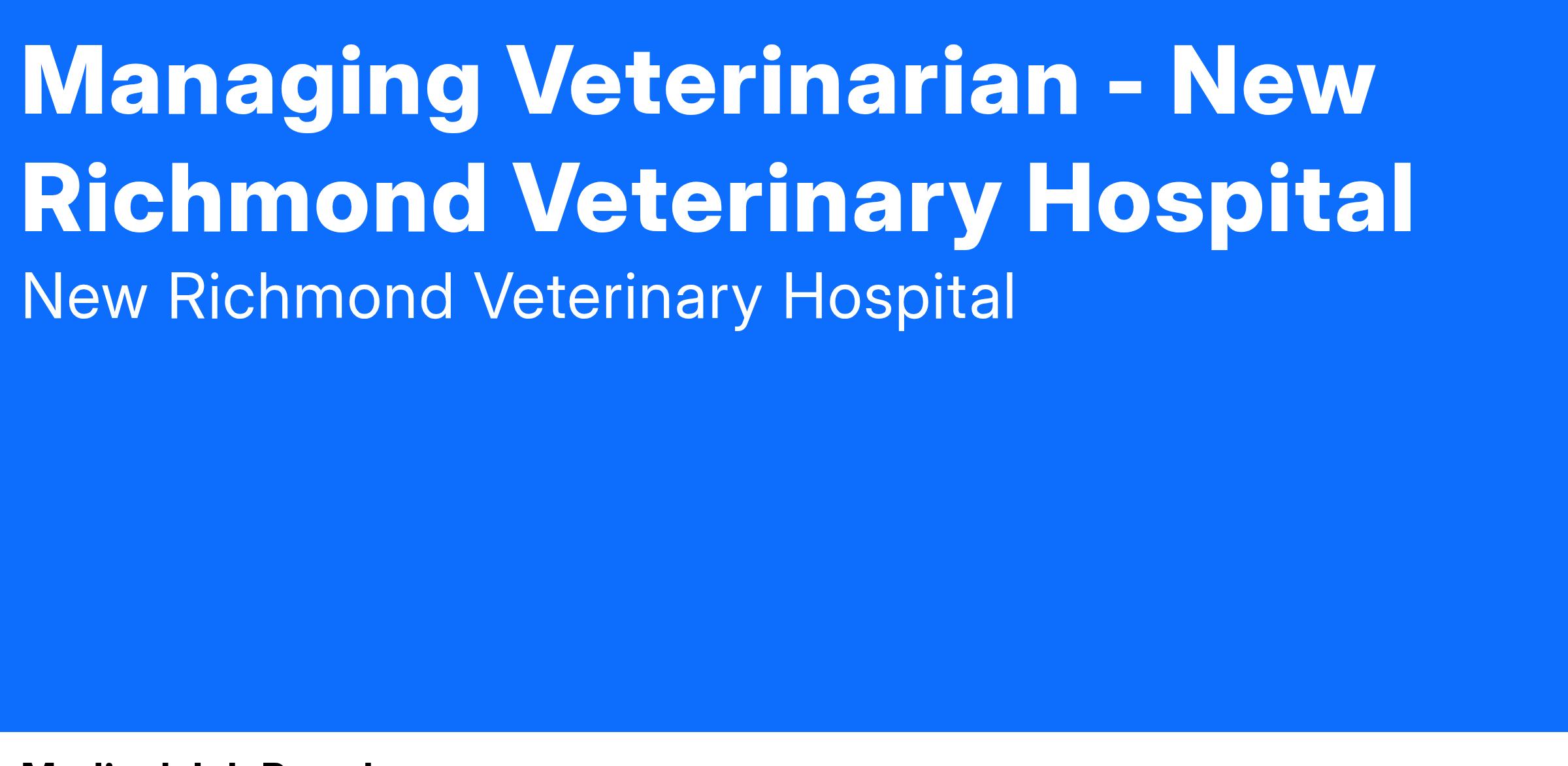 The Managing DVM at New Richmond Veterinary Clinic is a key leadership role. This individual will be responsible for providing medical and non-medical leadership for the practice, managing associate veterinarians, and ensuring regulatory compliance relating to veterinary medicine. They will also be responsible for creating an environment of teamwork and collaboration in which quality medicine is delivered. Additional responsibilities include guiding the direction of the practice, advancing medical care, and monitoring the practice's financial performance.