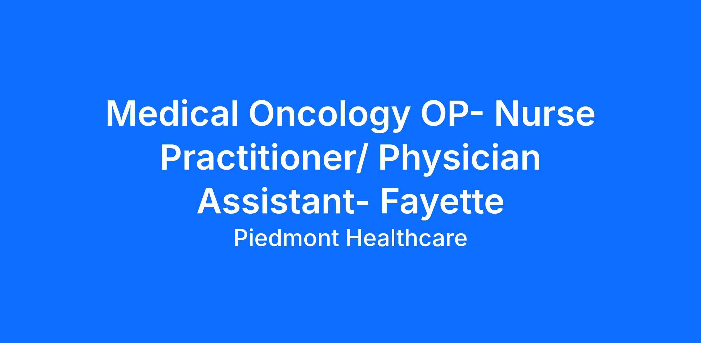 Piedmont Healthcare is recruiting for a Physician Assistant or Nurse Practitioner to join the Piedmont Physicians Medical Oncology Practice at Piedmont Fayette. This is a Monday-Friday position with inpatient and outpatient responsibilities. Night/weekend call coverage in a rotating call pool.