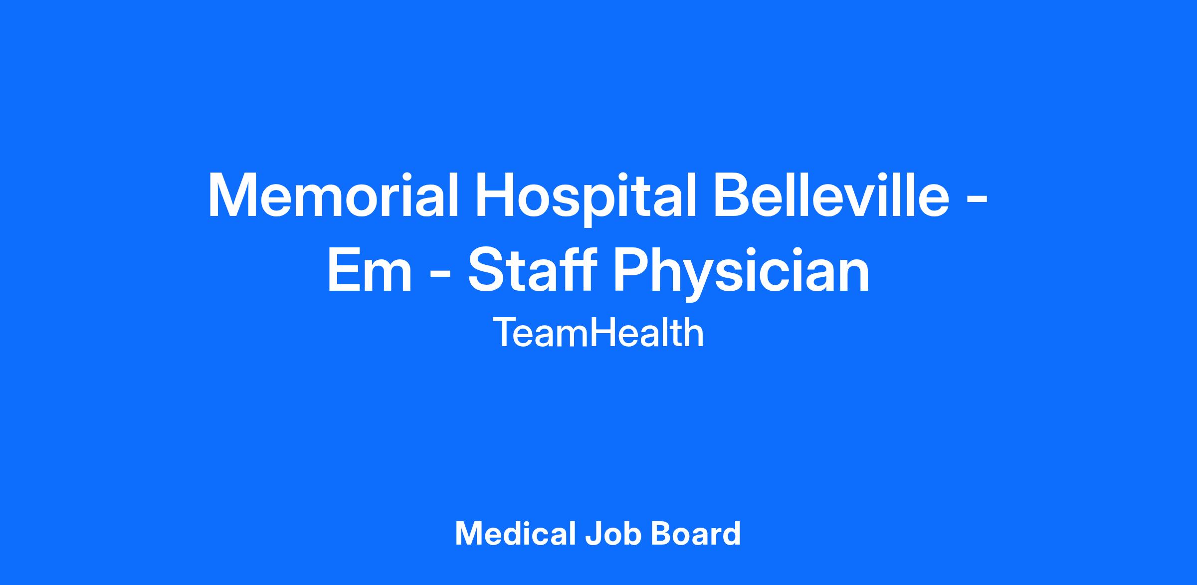 Job DescriptionAre you a clinician who aims to make a difference in the lives of your patients by providing quality care? TeamHealth needs someone like you! We have an excellent opportunity for a physician to join our team at Memorial Hospital in Bellville, Illinois. Memorial Hospital Belleville is a non-profit organization affiliated with BJC Healthcare. The facility is an accredited chest pain center with PCI by the Society of Chest pain center. Memorial Hospital Belleville has served the community since 1958 and focuses on excellent patient outcomes and experiences.