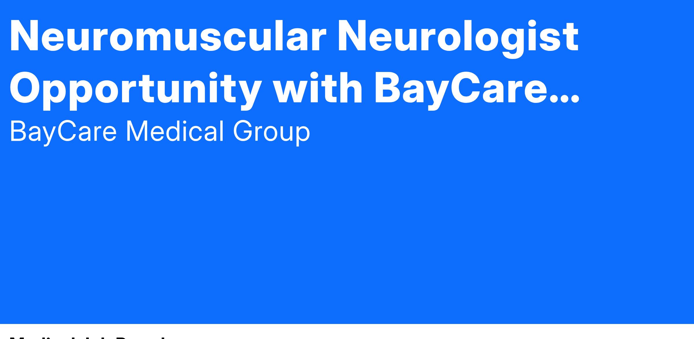 BayCare Medical Group is seeking a board eligible/certified Neurologist with fellowship training in Neuromuscular Medicine to join our established office located on the campus of St. Anthony's Hospital in St. Petersburg, Florida.
