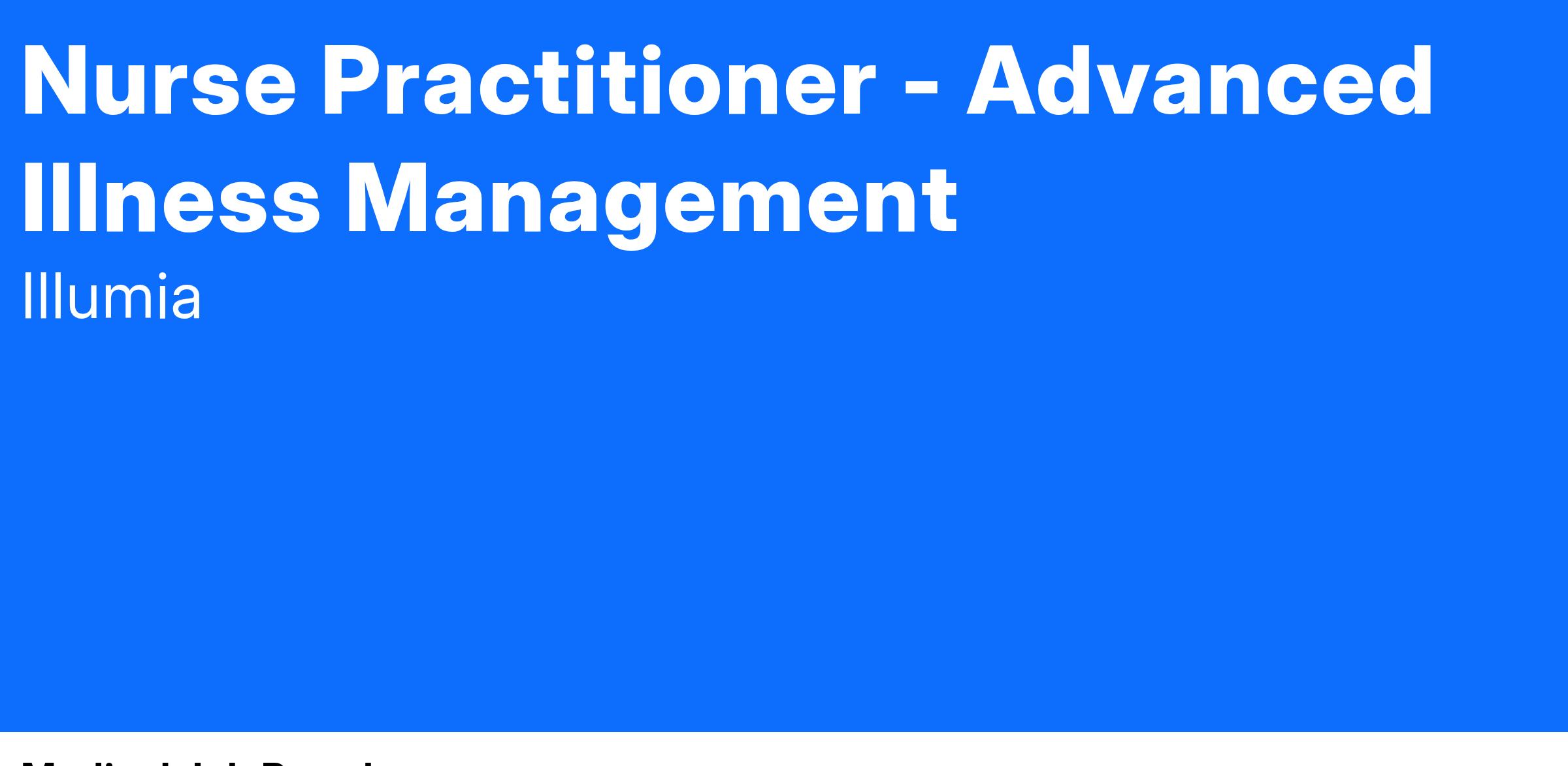 The Nurse Practitioner - Advanced Illness Management (AIM) Program facilitates advanced illness management and palliative care for patients, ensuring a comprehensive, individualized treatment plan, while demonstrating excellent clinical skills and ethical, relevant judgment. Provides diagnosis, treatment, consultation, and follow-up under the direction of the Palliative Medical Director or Primary Care physician.