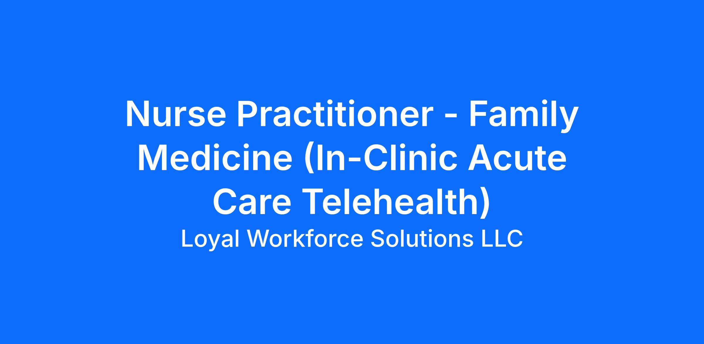 Loyal Workforce Solutions has partnered with a major Federally Qualified Health Center (FQHC) with multi-specialty outpatient clinics located throughout Los Angeles County is seeking dedicated and mission oriented Nurse Practitioners to conduct telemedicine visits at our Highland Park location.