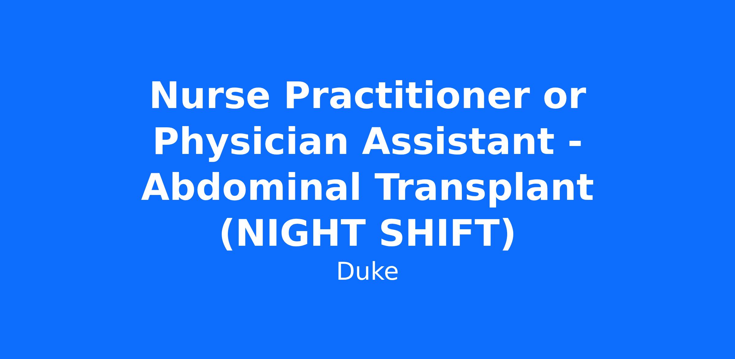 The Duke Abdominal Transplant Surgery Hospitalist Advanced Practice Provider (NP or PA-C) provides direct patient care services for surgically and medically ill adult transplant and general surgery patients in Duke Hospital, in collaboration with physicians. The NP or PA performs physical exams, collects and documents data, conducts diagnostic and therapeutic procedures, orders and schedules laboratory studies and professional consultations, prescribes appropriate interventions and medications, coordinates the care and discharge of patients, may assist in the operating room and provides direct patient care services. The Nurse Practitioner or Physician Assistant contributes to excellence in patient care, research, teaching and provides leadership in the organization. This position has no operating room responsibilities.