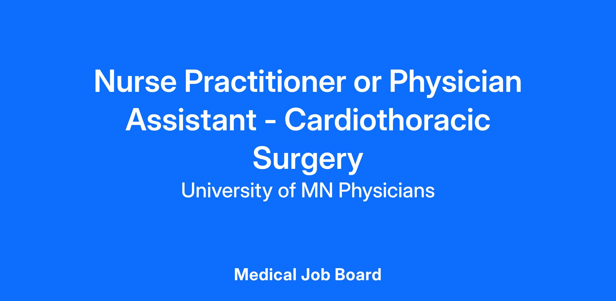 University of Minnesota Physicians is seeking a Certified Nurse Practitioner or a Certified Physician Assistant to join our Cardiothoracic Surgery Team, primarily at University of Minnesota Medical Center.
