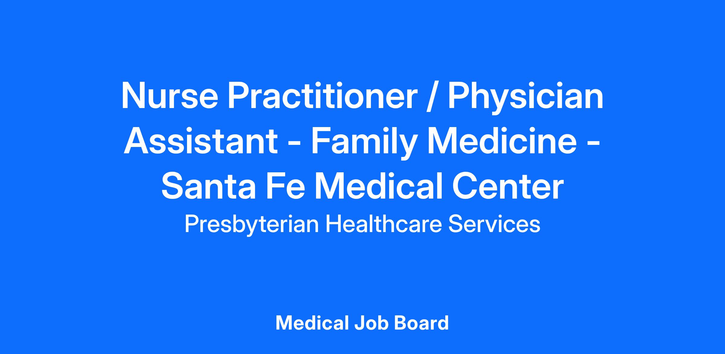 Presbyterian Medical Group seeks a Nurse Practitioner or Physician Assistant to join our established practice in Santa Fe, New Mexico. We're all about well-being, starting with yours. We offer a nationally competitive salary with relocation allowance available, CME allowance and fully paid malpractice insurance.