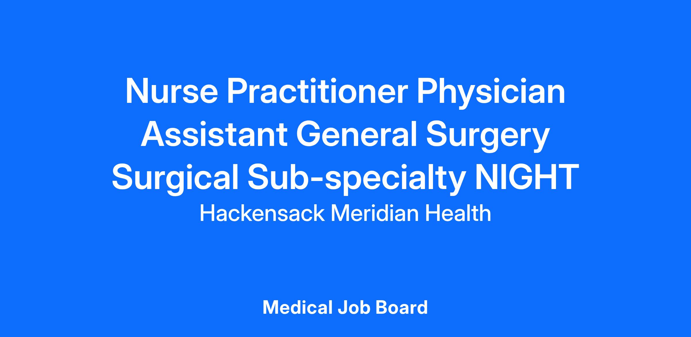 The General surgery and surgical subspecialty Nurse Practitioner or Physician Assistant manages the overnight inpatient and operative needs of surgical patients in conjunction with, and under the supervision of an attending physician . The NP is responsible for the assessment and management of various patient populations which includes the overall management of the orthopedic surgical patient, ordering and interpretation of diagnostic testing, development of appropriate plans of care, therapeutic interventions. They maintain a collaborative work environment that is safe, just, and founded on principles of high reliability and quality outcomes for patients and colleagues. The NP will perform duties in accordance with state and federal regulations as well as network policies, NP scope of practice guidelines, approved clinical privileges and the JFKUMC NP policy. The Nurse Practitioner reports to the department clinical lead and Director of Advanced Practice Providers, Full time includes weekends and holidays on a rotational basis.