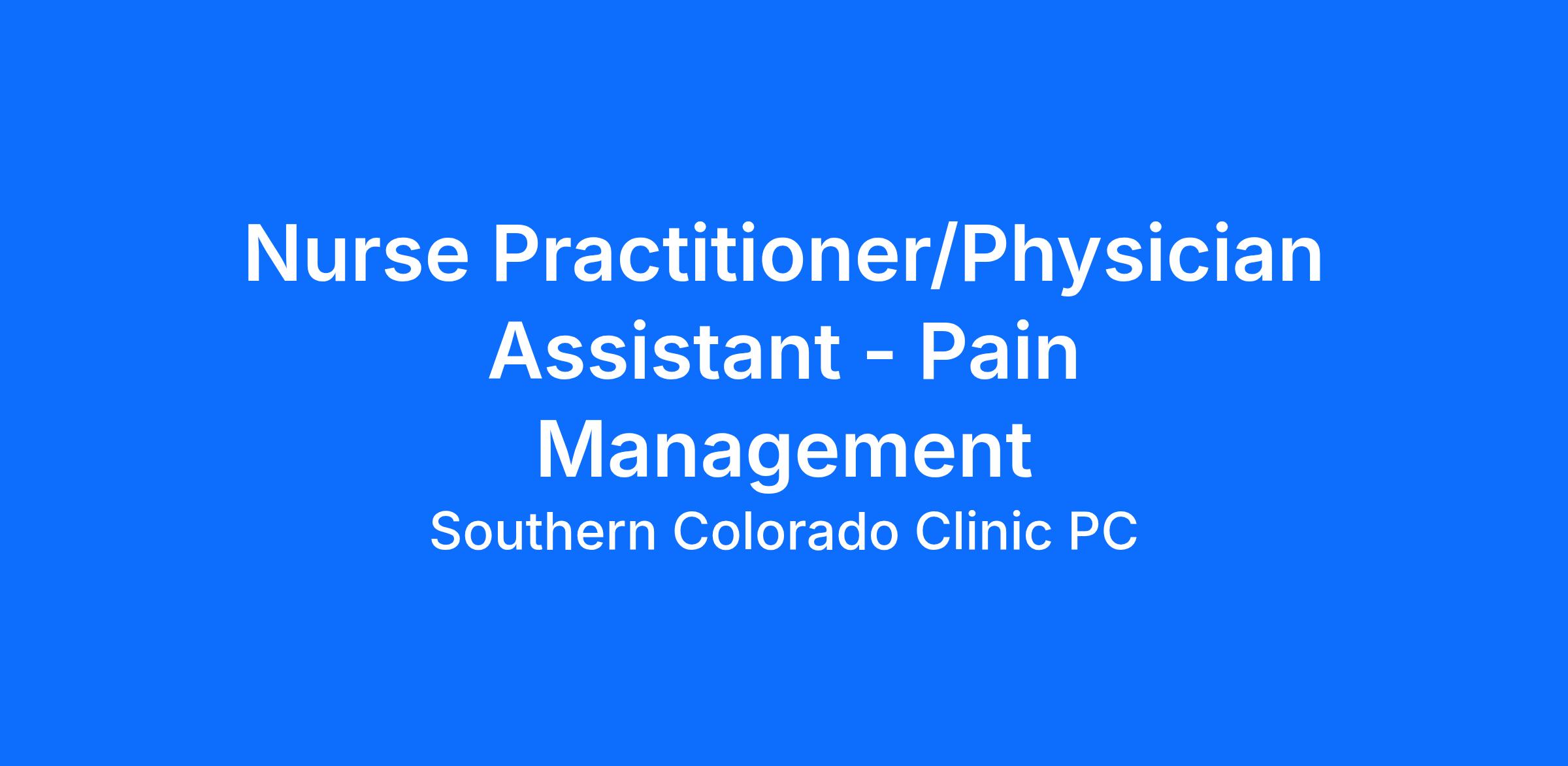 Our Pain management team at Southern Colorado Clinic is seeking a Full-time Pain Management Nurse Practitioner or Physician Assistant with active Colorado license, DEA and prescriptive authority.