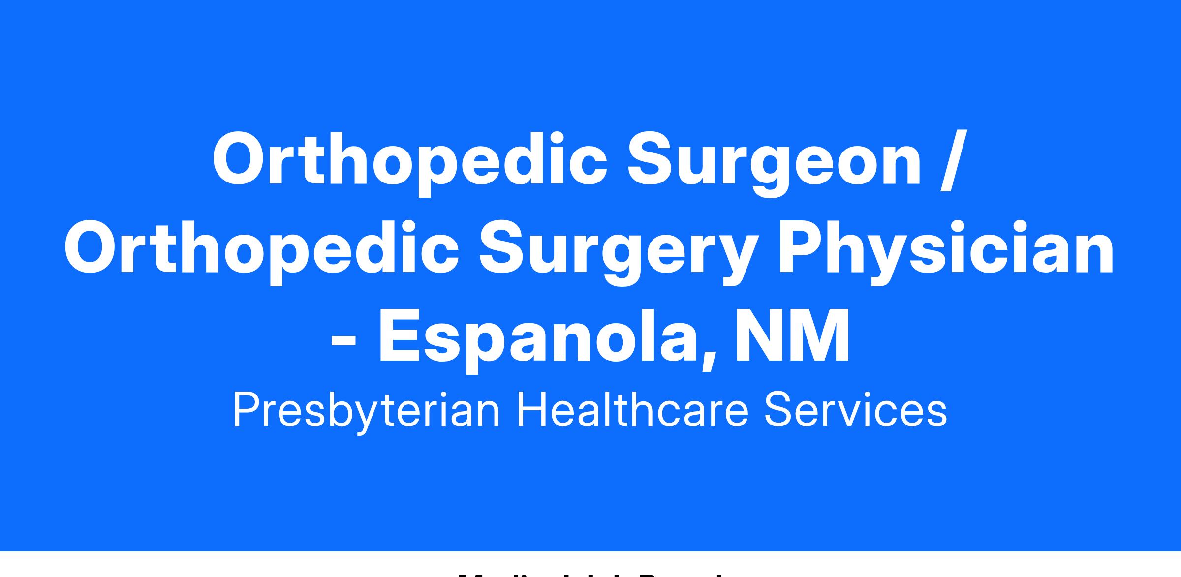 Presbyterian Espanola Hospital in Espanola, New Mexico is seeking a Board Eligible / Board Certified Orthopedic Surgery trained physician to join our group. This is a full-time position with our employed provider group, Presbyterian Medical Group.