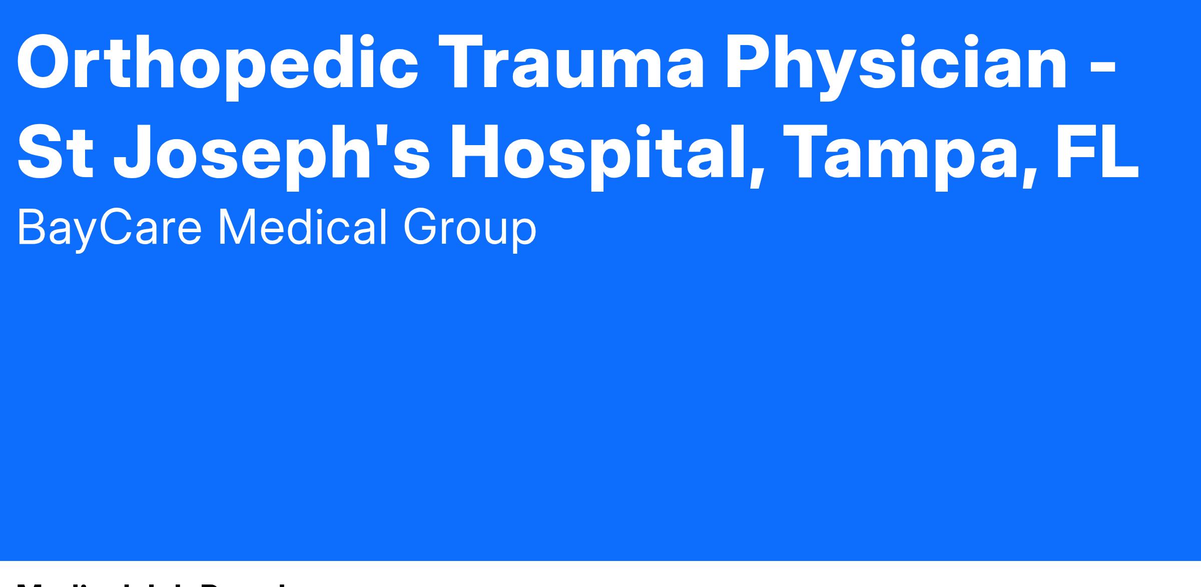 BayCare Medical Group, the leading medical group in the Tampa Bay area, is seeking a fellowship-trained Orthopedic Trauma Surgeon to join our expanding team at St. Joseph’s Hospital, a busy Level II Trauma Center in Tampa, Florida. This new position supports growing patient volume and trauma call needs, offering the opportunity to work alongside a skilled, collaborative team within a leading, patient-focused health system.