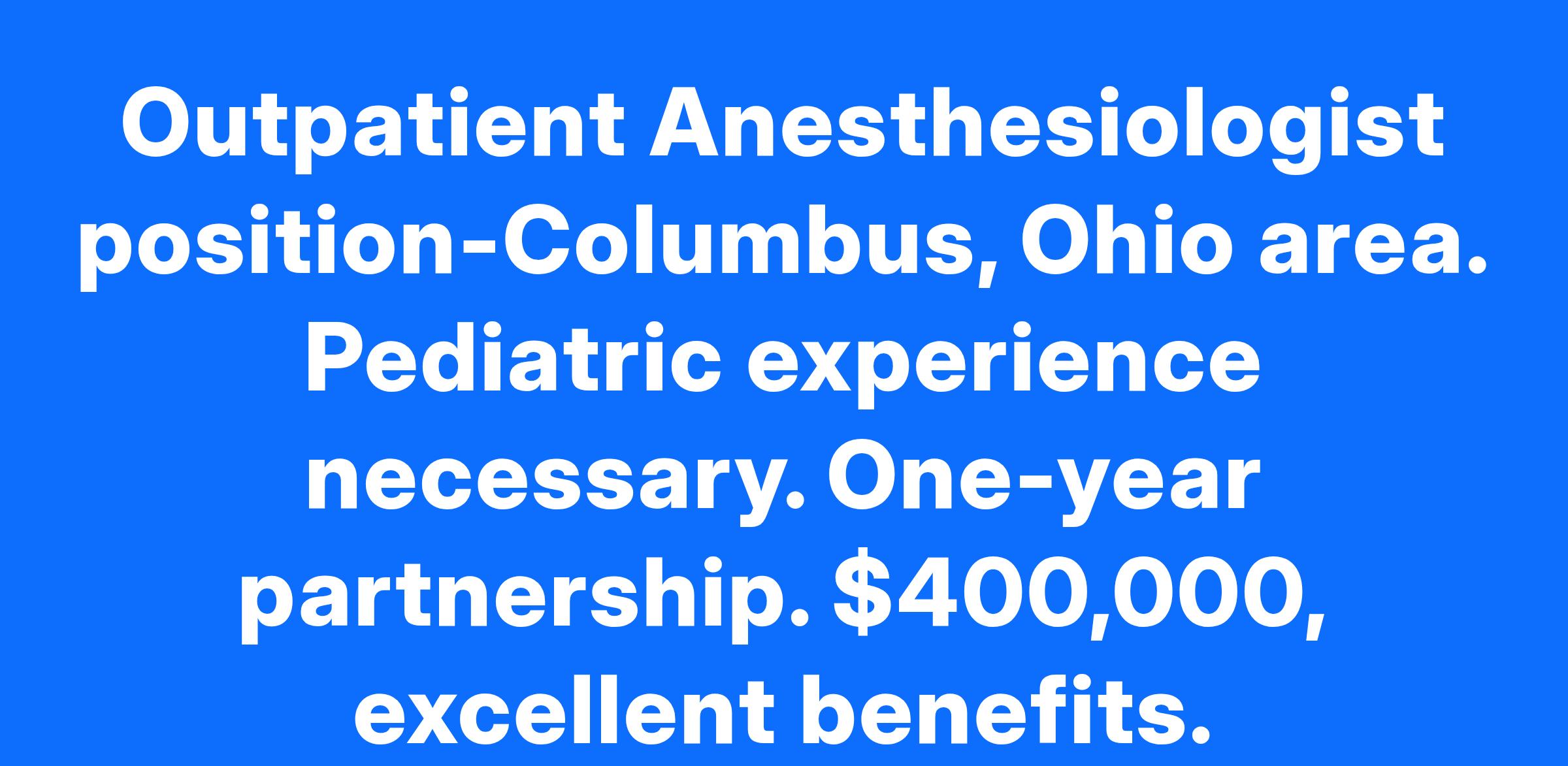 Outpatient Anesthesiologist position-Columbus, Ohio area. Pediatric experience necessary. One-year partnership. $400,000, excellent benefits.