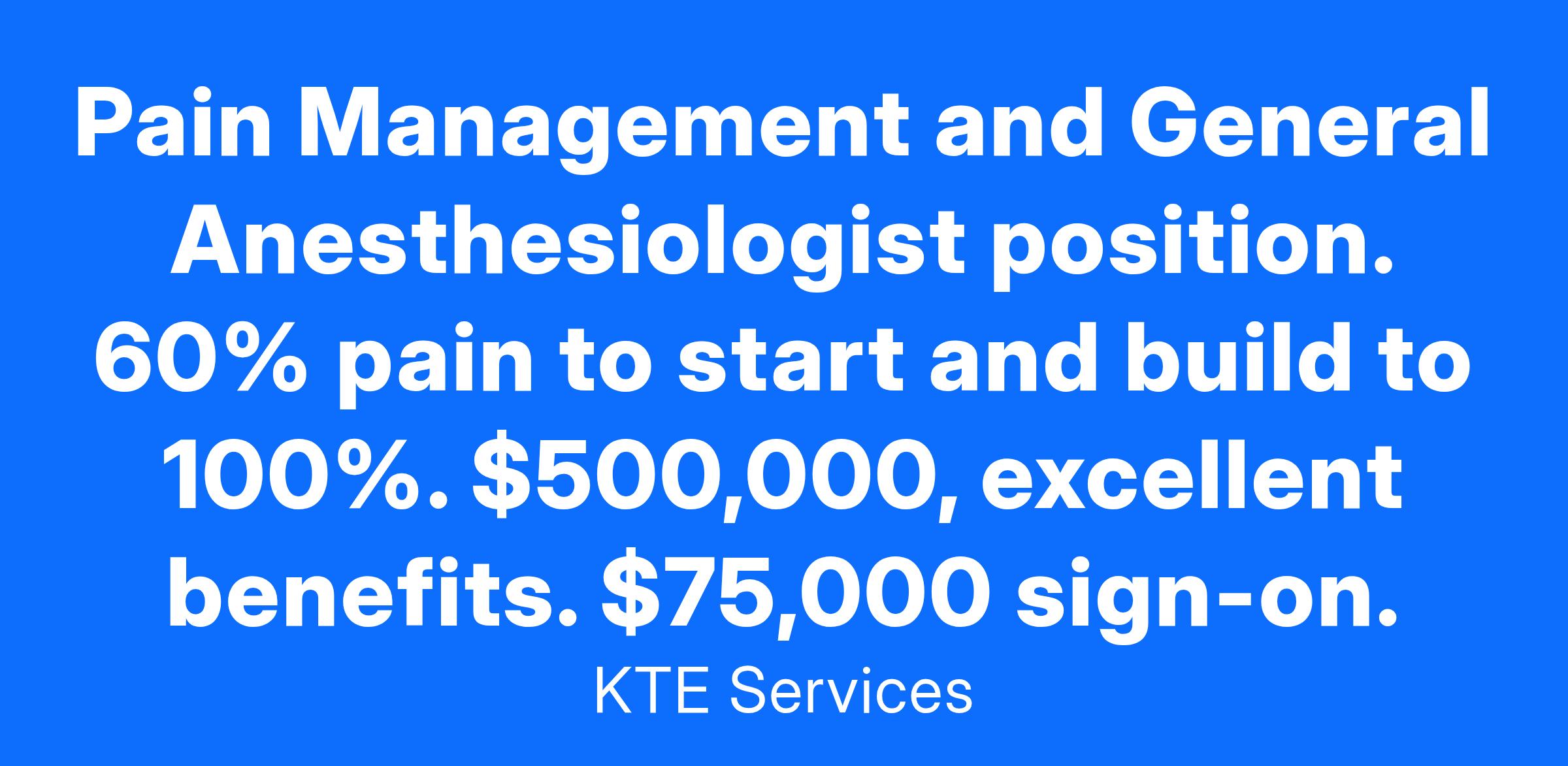 Pain Management and General Anesthesiologist position. 60% pain to start and build to 100%. $500,000, excellent benefits. $75,000 sign-on.