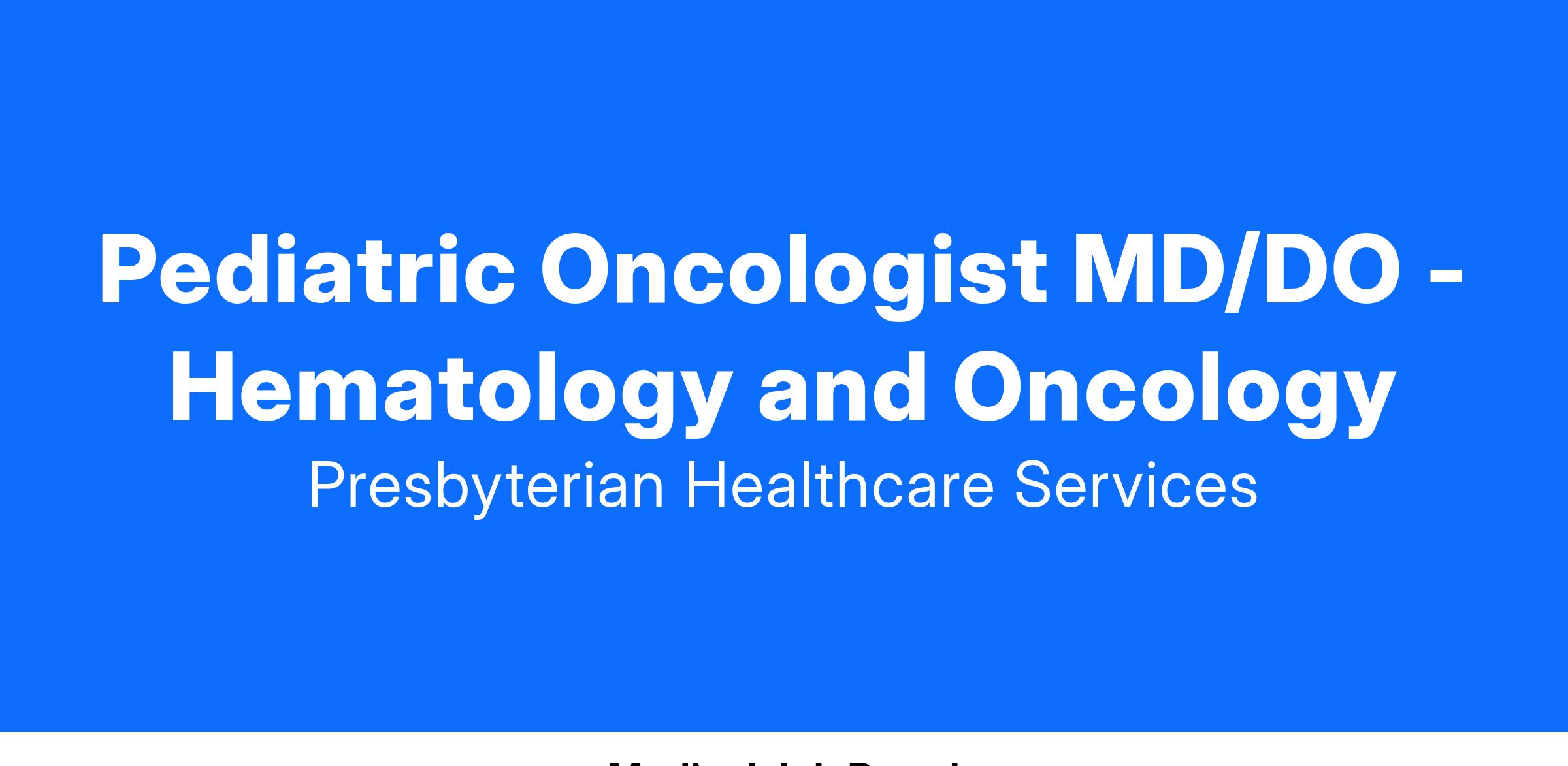 Presbyterian Medical Group seeks a Board Eligible / Board Certified Pediatric Oncologist - Hematology and Oncology to join our established practice in Albuquerque, New Mexico. We're all about well-being, starting with yours. We offer a nationally competitive salary with relocation allowance available, CME allowance and fully paid malpractice insurance.