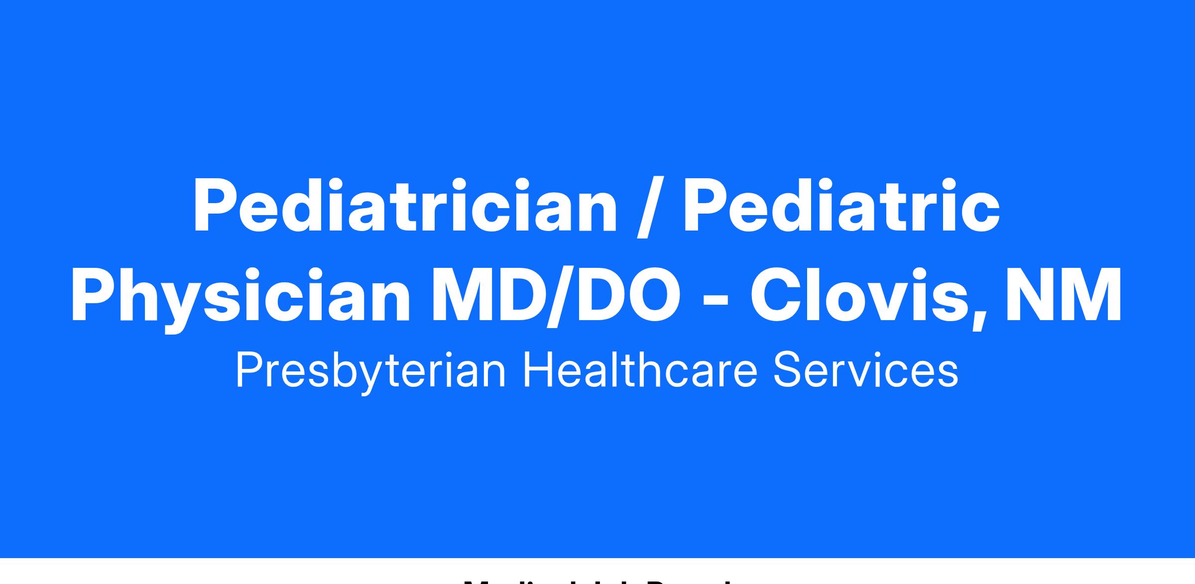 Presbyterian Healthcare Services, a locally owned, not-for-profit healthcare system in New Mexico, is seeking a Board Eligible or Board Certified Pediatrician to join our growing team of exceptional clinicians and staff in Clovis, NM. We offer a nationally competitive salary with relocation allowance available, CME allowance and fully paid malpractice insurance.