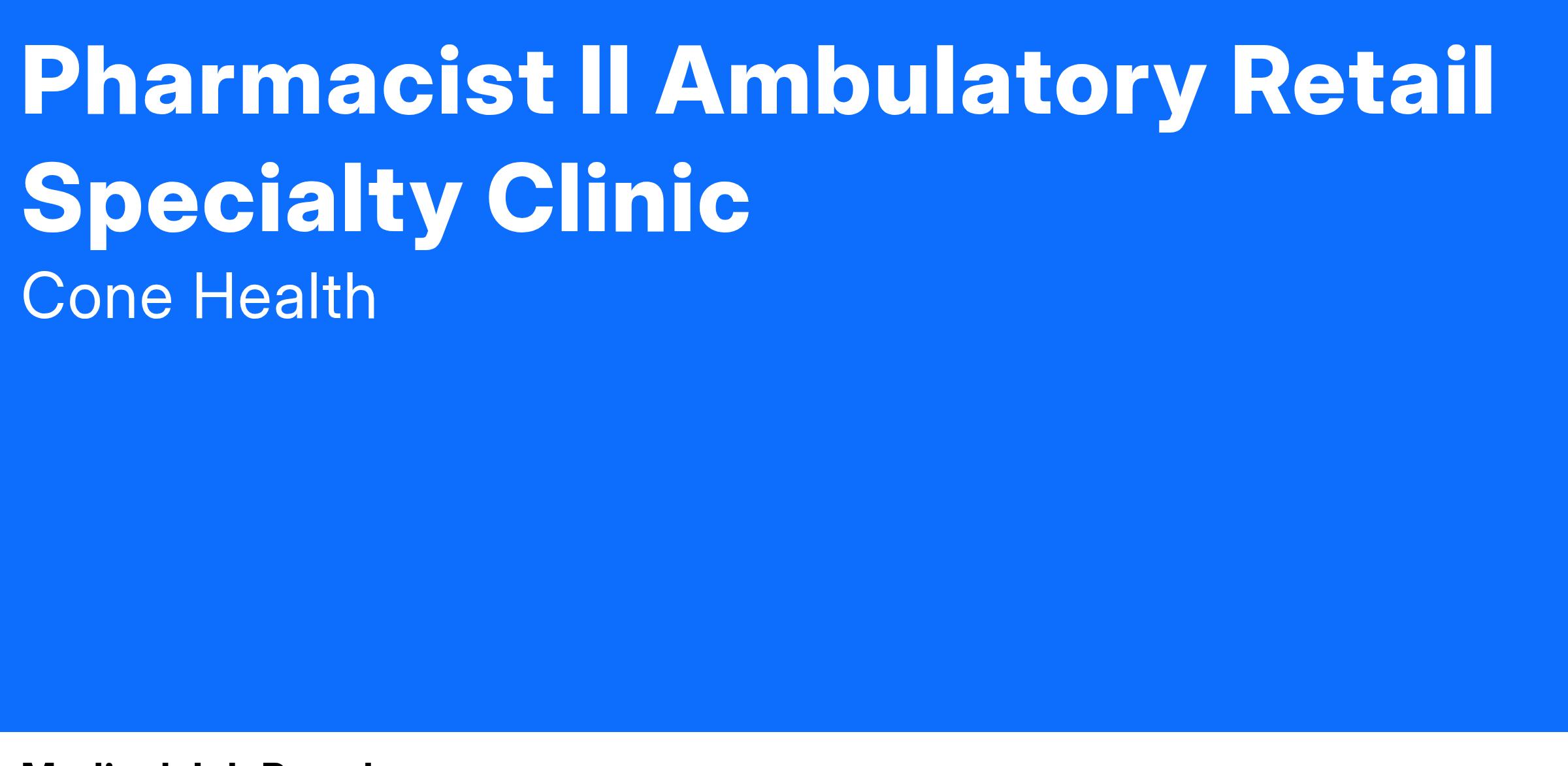 | The Pharmacist II Ambulatory Retail Specialty Clinic prepares and dispenses prescribed medications to patients in the community setting. This role educates patients, supervises pharmacy technicians and operates under the general supervision of a pharmacist manager. |