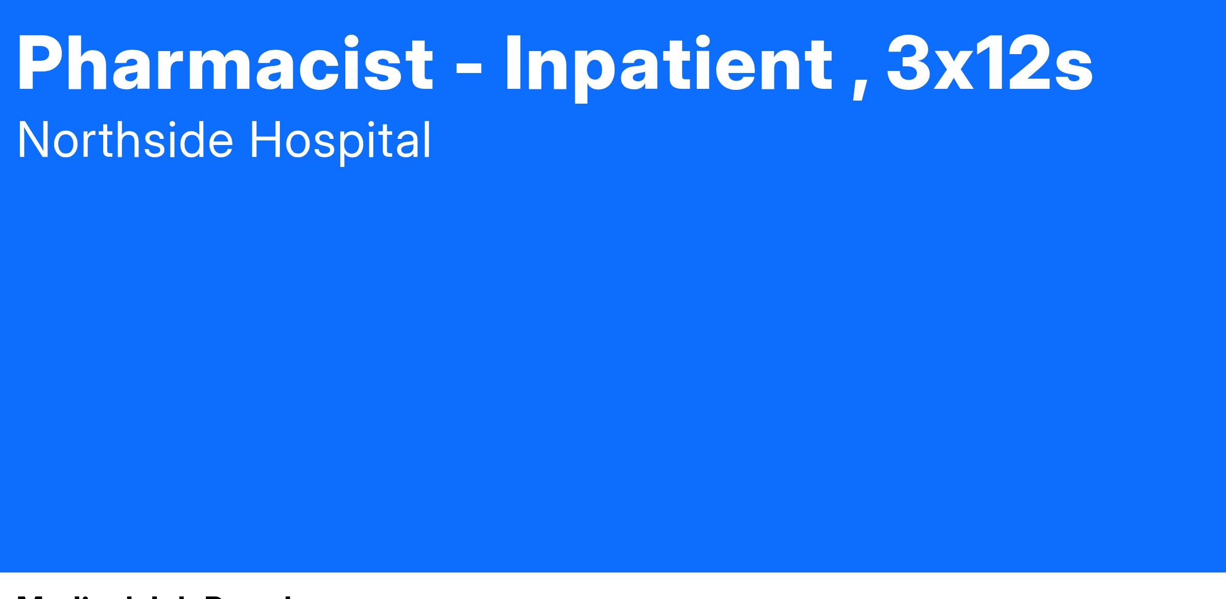 The Pharmacist will be working 3x12h shifts / week , 830a-9p and rotating every fourth weekend.