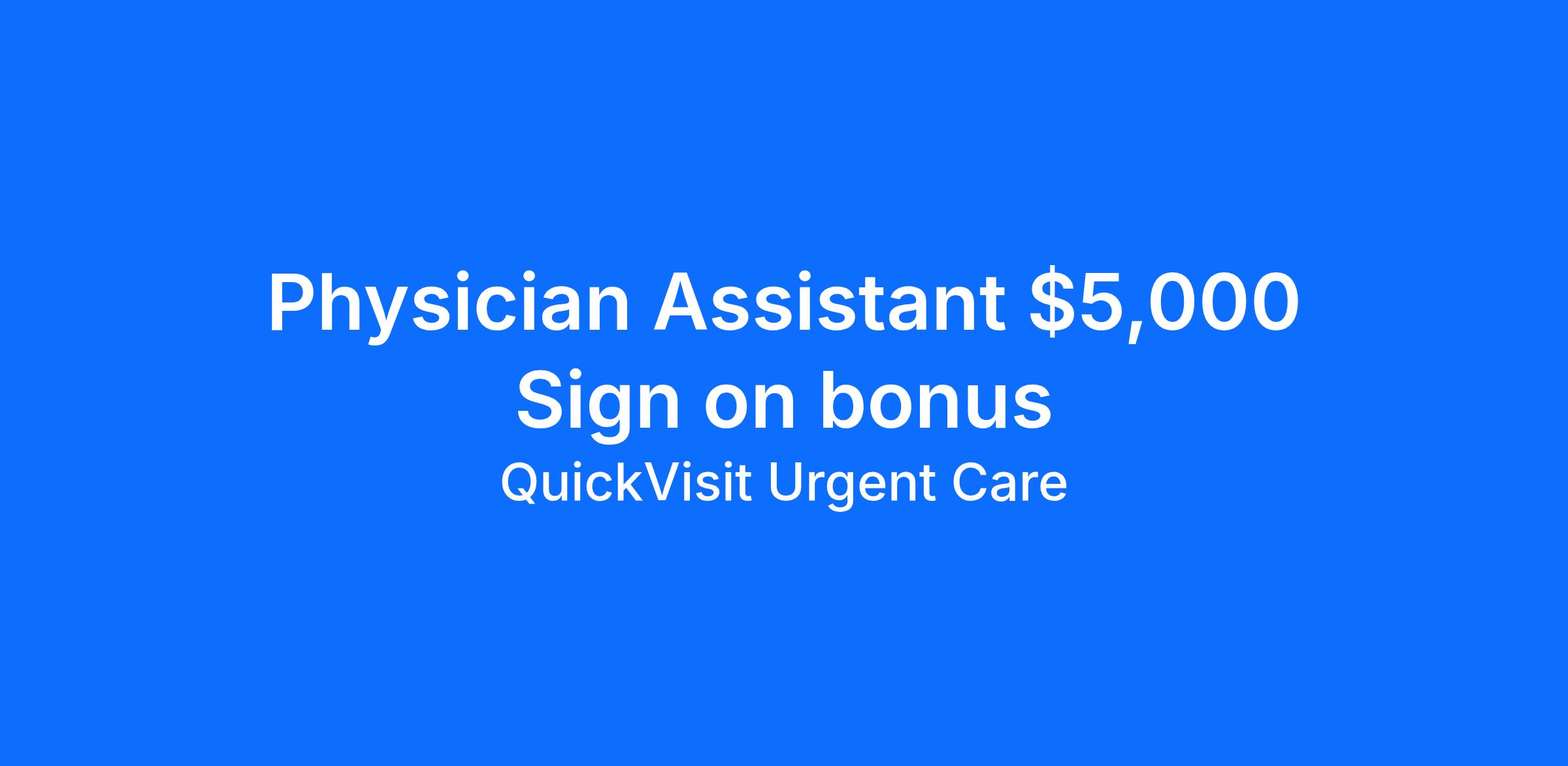 What We’re Looking For: If you're a Physician Assistant that goes above and beyond to deliver exceptional patient care, challenge yourself and your coworkers towards growth, thrive in a fast-paced environment, and want to change the lives of your patients and our community then we invite you to become a part of our family at QuickVisit Urgent Care. We can’t wait to connect with you!